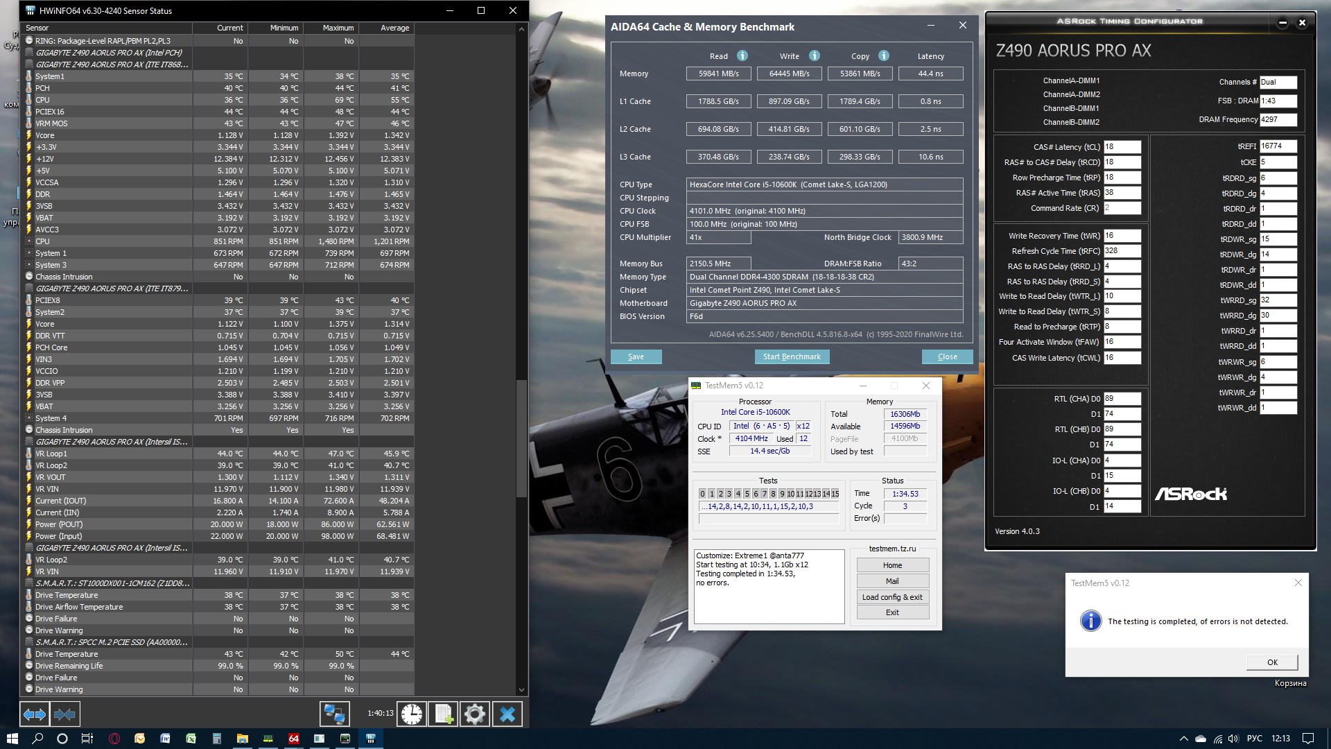 Всем привет! Вот что получилось сделать в первый раз на платформе Intel. прошу конструктивной критики ну и помощи! CPU Name: Intel® Core™ i5-10600k CPU @ 4.80GHz Motherboard Model:Gigabyte Z490 Aorus Pro AX (F6d) Total Size:16305 МБ (DDR4 SDRAM) Kingston HyperX KHX3600C17D4/8GX Frequency: 4300MHz - Ratio 1:43 Timings: 18-18-18-38-2 (tCAS-tRC-tRP-tRAS-tCR) Slot #2 Module: Kingston HyperX KHX3600C17D4/8GX Slot #4 Module: Kingston HyperX KHX3600C17D4/8GX