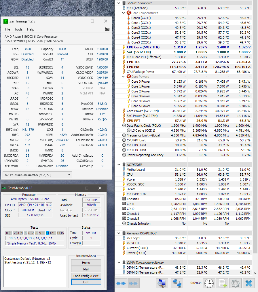 vol2008 странно, 40 градусов ни о чем для чипов. Микроны при 45-48 в стрессе прекрасно пахали. А последние две причины интересны, у меня автоматом CKE=0, например. И повышение до 1.42-1.45 Vdimm приводит к большому числу ошибок. Просто штатный режим 4000@cl19 (20-19--19-39) при 1.35В никакого нагрева не должен давать и должен работать... А фиг.