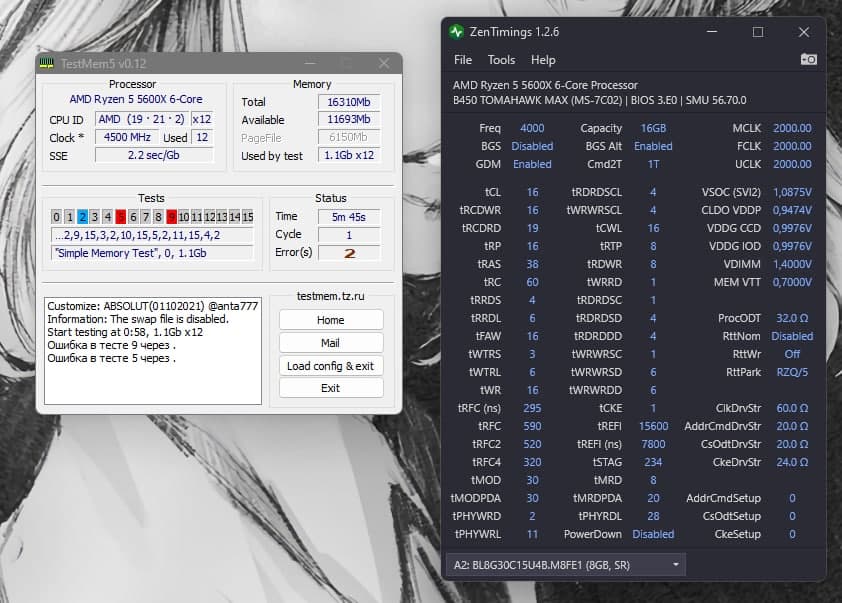 The KMS Доброго времени суток, не подскажете, что можно поднастроить, поскольку не нашел лист для ошибок для абсолютовского конфига анты то отталкивать от чего то сложно, хотя я думаю, что ошибки примерно похожи с тем, что у 1usmus Пересел с 3600 на 5600х и решил взять свой же конфиг который там прекрасно, и стабильно работал больше года, решил поднять некоторые тайминги но это не особо помогло, идут сразу ошибки почти в 1 тесте при 14 CDWR RP, а на 16 уже в 6-9, ну это как я понял уже вольтаж ну и куча whea сыпет P.S сам конфиг на 3800 еще не пробовал, а решил сразу 4000 штурмовать, ну раз запускается и не сыпет в синьку то ему по силам такое наверное P.S.2 сам проц на 4.5 локнул при 1.225 llc 3, ниже не хочет linx проходить, не уверен что стабильно, но буду проверять позже Возможно здесь уже нужны другие кадбасы, вольтажи на VDPP CCD IOD Ну и хотелось бы узнать от чего PHYRDL зависит, он у меня там иногда скакал с 26 на 28, тут пока только 28 видел