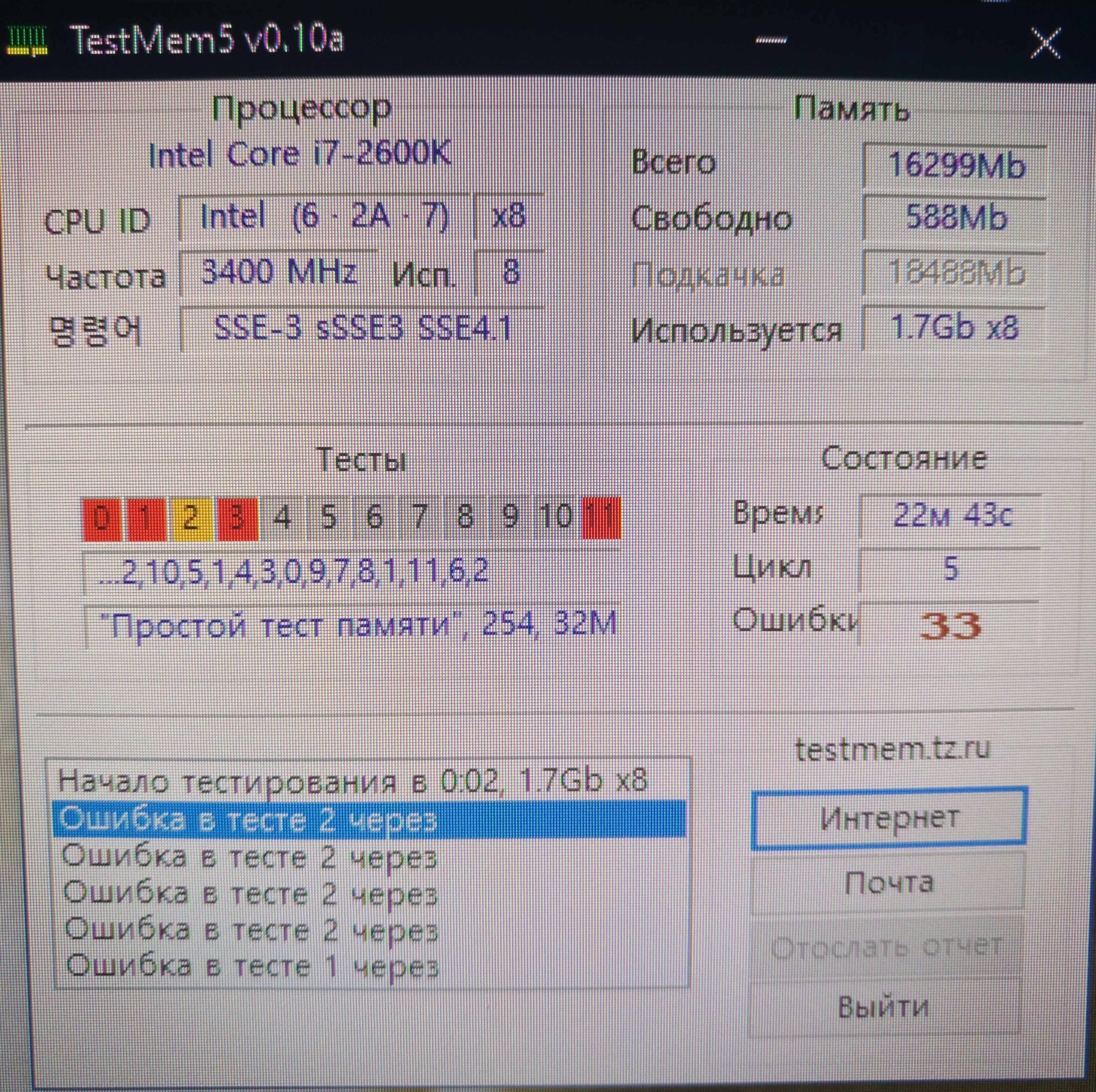 MemTest 4.0 (HCI Design): Эта незатейливая программка, как вы наверное догадались из названия, тестирует память. Для большей нагрузки, рекомендуется использовать несколько копий программы одновременно, указав в каждой объем доступной памяти деленный на количество запущенных копий. Как вариант особо изощренного тестирования - запустите количество экземпляров соответствующее количеству ядер вашего процессора, привязав каждый к отдельному ядру через диспетчер задач.