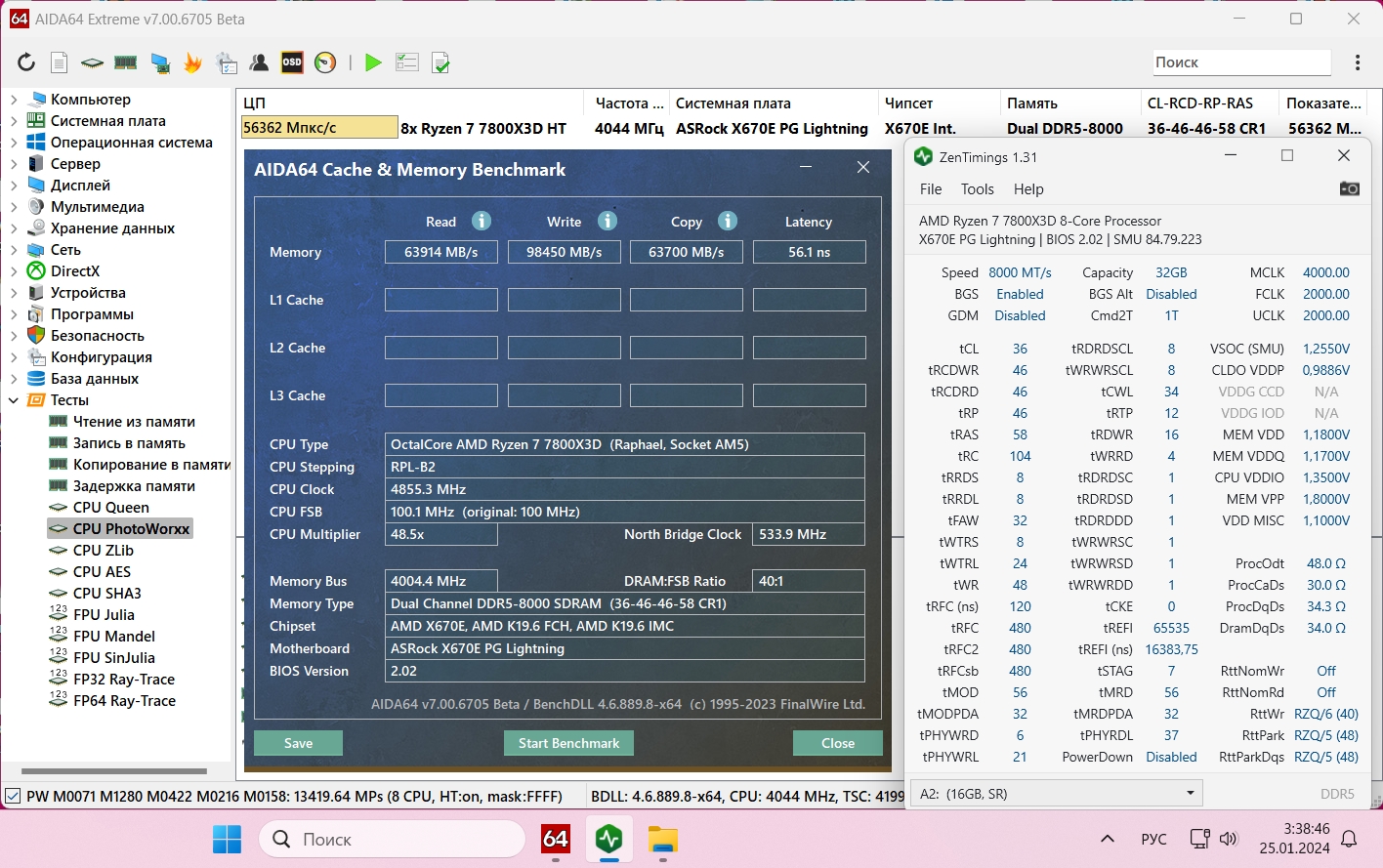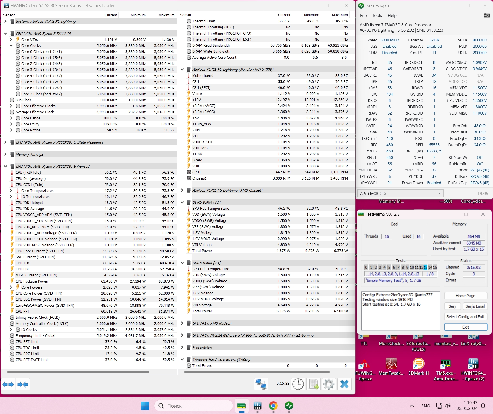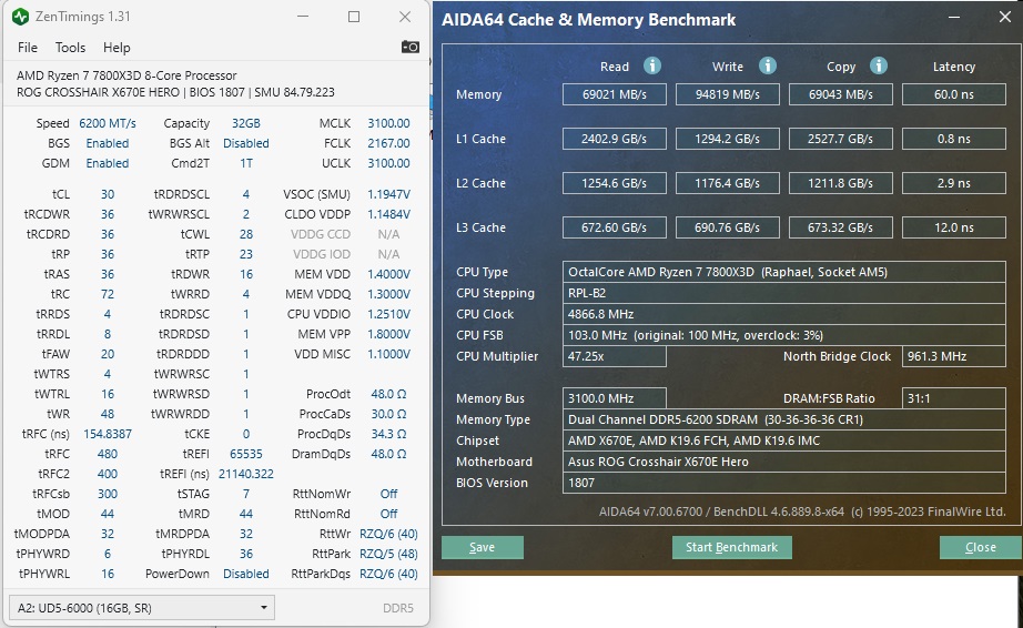 В отличие от Z490 платформы с парой двуранговых B-Die на настройку памяти под AM5 ушло два дня вместо месяца выноса мозга в случае с intel. Когда приедет водоблок, продолжу эксперименты с напряжениями (сейчас древний однобашенный thermalright venomous x под 115х просто лежит на крышке 7800x3d), но пока так как на скриншоте. Не могу понять,почему не снижаются задержки. Хотя бы ниже 60ns - ну ни в какую. Подскажите, куда бы ужаться. Это на 1807 биос для X670e Crosshair Hero и 2х16 Team T-create Expert 6000 30-36-36-76@1.35v. Знаю, tRAS не по формуле, но AIDA показывает более высокий результат. Попробую MemVDD снизить до стоковых 1.35. Ну и с IF поиграться, вдруг на 2200 поедет.