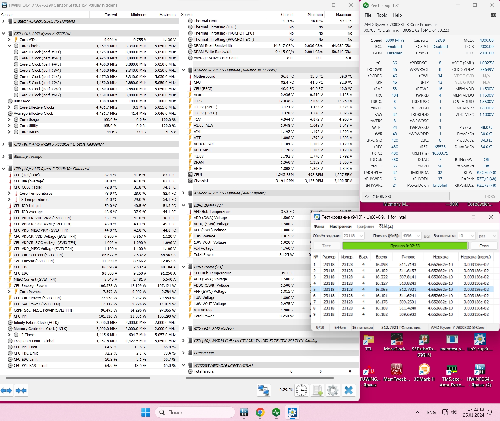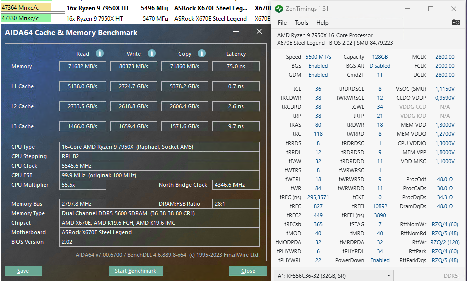 Asrock b670e Steel Legend bios 2.02 AGESA 1.1.0.0 + 7950x + 4*32ГБ KF556C36BBE-32 (тайфун сообщает A-die) Стартовало по дефолту на 3600МГц, погуглил, проставил сопротивления получалось запускать все 4 плашки и до 6000 но не было стабильности. Решено было выставить 5600 и дефолтные первички/вторички из профиля памяти expo. Некоторая стабильность была найдена при разнице напряжений Vsoc и VDDP в 170мВ но Vsoc просаживался при нагрузке. С LLC level 2 для VSoc просадки ушли но стало менее стабильно. Стабильность вновь нашлась при разнице 155мВ по мониторингу (задано VDDP=0.960 VSoc=1.120). Если отключить GDM то кранчер выдает ошибку примерно через 30 мин. С включенным GDM кранчер стабилен 15 часов, ТМ5 экстрим стабилен 14 часов. Есть ли пожелания/предложения что можно поправить в "математике" субтаймингов?