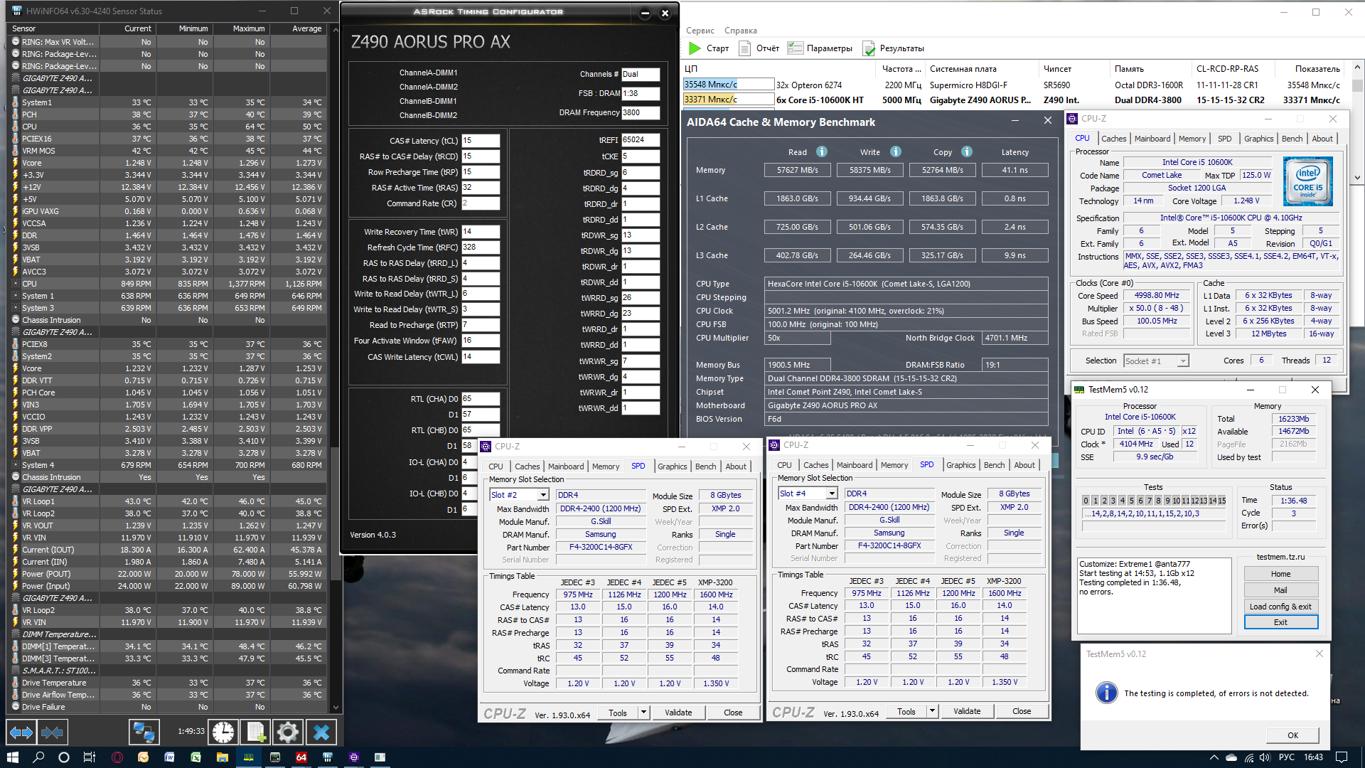 Всем привет! Перевод в нс для меня темный лес. Теперь нужна помощь для поднятия частоты: Intel Core i5-10600k@5.0GHz; Motherboard: Gigabyte Z490 Aorus Pro AX (fd6); Total Size: 16232 MB; Type: Single Chanel (64 bit) DDR4-SDRAM Frequncy: 3800MHz Ratio 1:19 Timings: 15-15-15-32-48-2 (tCL-tRC-tRP-tRAS-CR) Slot #2 Module: G.Skill [F4-3200C14-8GFX] Slot #4 Module: G.Skill [F4-3200C14-8GFX] Напряжения: VCCIO/VCCSA - 1.26V/1.20V; VDRAM 1.46V