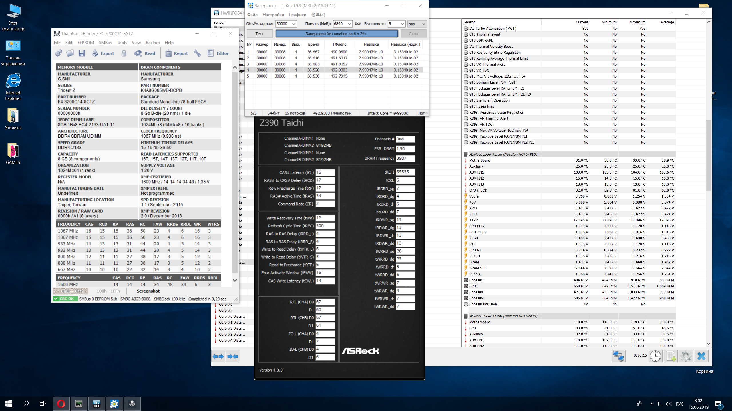 Добавлено спустя 3 минуты 6 секунд: Доброе утро. Процессор 9900к в стоке Мать ASRock Z390 Taichi Опенративная память 16Gb DDR4 3200MHz G.Skill Trident Z (F4-3200C14D-16GTZ) (2x8Gb KIT) IO-1.216 SA-1.253 DRAM-1.432 Все тесты проходит на зависает в играх Far Cray и Metro после 10-15 мин игры. Подскажите что можно подправить.