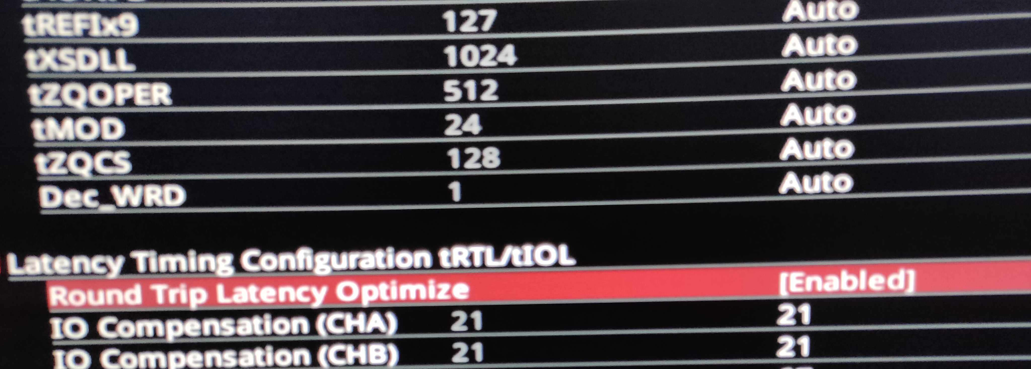 Начните с RCD, CL. Не обязательно должны быть одинаковыми, обычно CL идёт меньше чем RCD. RAS сразу пробуйте как RCD+CL+4, до этого значения от него существенная разница, дальше меньше. CWL<=CL. Допустимые значения 9,10,11,12,14,16,18,20. RP можете выставить по RCD, если пойдёт меньше - тоже неплохо, не уверен правда насчёт смысла. RTP без формул. Если не идёт вниз можно попробовать поднять чуть чуть RP. В DDR4 явно связан с WR соотношением 2 к 1 (например WR20\RTP10), физически хранится одно значения и в зависимости от операции интерпретируется. Скрутите FAW до 16(так и оставьте если работает). С таким FAW скручивайте RRD(оба, L обычно больше чем S), возможно поедут на 4 оба. Если до 4 не удалось спустить поднимите FAW до уровня RRDL*4 и попробуйте ещё, хотя это скорее всего уже почти предел. Обычно L>=S. L - SG(Same Group). S - DG(Different Group) Напр. RRD_L>=RRD_S. CKE=5 СCDL>=4 RDRD_DD и прочие подобные можно проигнорировать если у вас нет двух планок на один канал (4 планки). DD-Different Dimm. Тоже самое с DR-Different Rank если у вас одноранговая память. RDWR_SG(DG) и подобные сочетания скручивайте до минимальных рабочих, потом накиньте сверху +2. Как уже отметил обычно SG>=DG. WTR не трогайте он сам спустится когда будете скидывать WRRD_SG(DG) и прочие подобные. Если сам меньше не стал тогда руками скидывать. WR снижать через WRPRE если есть. Если нет или не снижает WR, То скрутите его скажем до 12 или +4 от рабочего, потом дожмёте если не лень будет. RFC явных формул нет, крутить после всего списка сверху. Не пытайтесь найти его минимальное значение если не хотите чтобы память начинала сыпать ошибками от любого чиха. найдите пограничное со стабильностью значение и накиньте сверху 20 или сразу 40. Может реагировать на RAS+RP, RRD, FAW, причём в обе стороны (то есть может "сломаться" если задрать названные), а может и не реагировать... REFi больше лучше. Связан с RFC. REFI сколько память "работает" - RFC сколько "отдыхает". Оба тайминга лучше не пытаться найти предельное значение.Заметно реагируют на температуру. Многие тайминги отзываются и на температуру и на напряжение. Поскольку напряжение может как позволить снизить тайминг, так и увеличить температуру, то середину можно искать очень долго, поэтому лучше бы вовремя остановится. Тестируйте тщательно с перезагрузками, сном, холодным стартом. RTL и IOL вам кто-то другой пусть советует как настраивать, от них у меня голова болеть начинает...