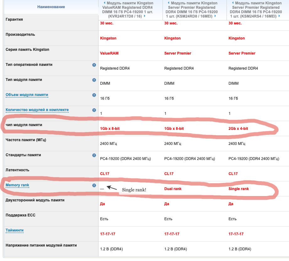Парни, подскажите по серверной DDR4 ECC. Имеется двухсокетная плата Asus Z10PE-D8 WS. К плате имеются две планки памяти по 16Gb каждая Kingston KVR24R17D8/16. Память одноранговая с чипами 1Gb x 8-bit. Для четырёхканала нужно докупить ещё две, но именно этой памяти уже не найти новой, б/у тоже не особо. Смотрю аналоги с такой же частотой и таймингами в никсе и есть вот такие два варианта: KSM24RD8/16MEI KSM24RS4/16MEI Однако с моими модулями у них есть различия. Первый модуль с чипами 1Gb x 8-bit, но двухранговый. Второй модуль с чипами 2Gb x 4-bit и одноранговый. Прикрепил скрин, где наглядно. Собственно и вопрос: критичны ли различия; и какое различие, если так можно выразиться, более критично? Детальный осмотр фото каких-то особых внешних различий не выявил. И собственно что значат 1Gb x 8-bit и 2Gb x 4-bit?