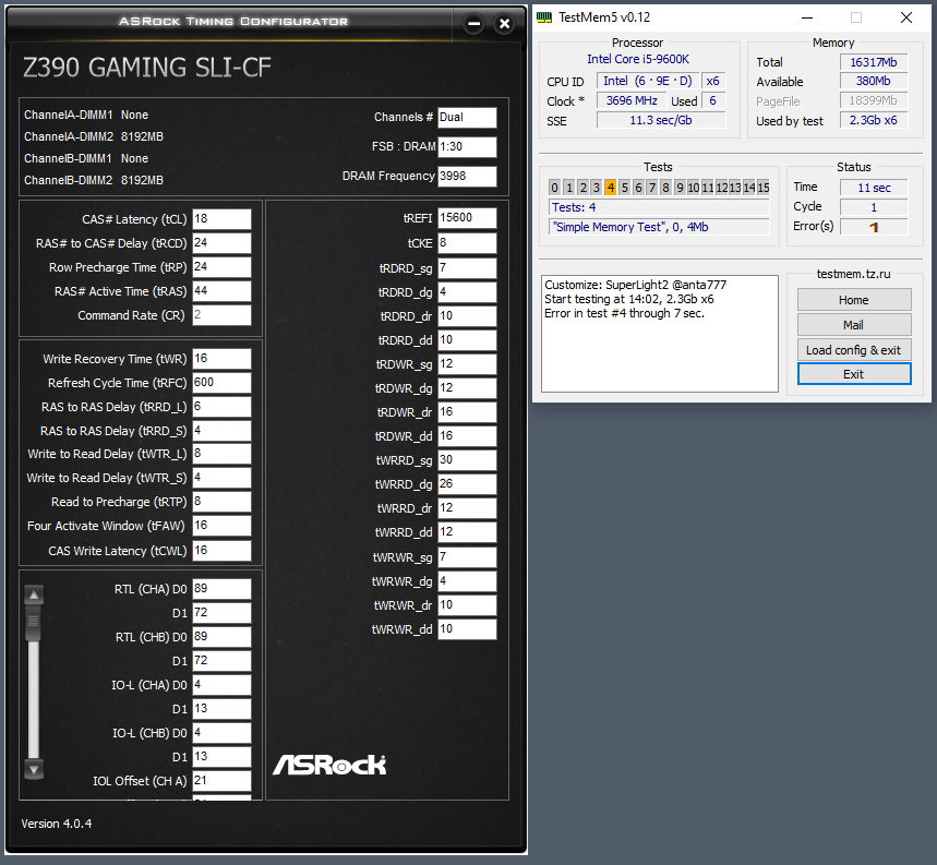 В общем прихожу к выводу о бессмысленности дальнейших попыток взять 4000 на моей недодоске. Взяв 3900 20-22-22-46 за отправную точку удалось даже снизить tCL до 18 (18-22-22-44). Ниже "первички" уже не идут, частоту выше тоже не поднять. Да и ну его к чёрту. В выходные надо ещё бенчмарков понаделать, надоело уже ковырять...