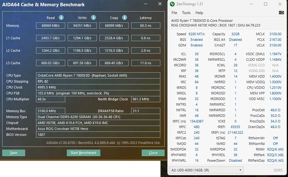 Тогда как у пользователя нашего форума получается ниже 55ns. Да, на 2200FCLK, но на 6000 частоте против моих 6200. Теряюсь пока, куда копать. Проц у него 7500, у меня 7800X3D. Ну не должно быть такой разницы. Да, опять забыл сбросить eCLK1 на дефолтные 100МГц, но он в AIDA на результаты не влияет - уже проверял. Пару вопросов дополнительно: значение North Bridge Clock - это что? В биосе не нашел, по крайней мере под таким названием. GDM у многих в ZenTiming указан disabled - тоже в Асусовском биосе поиском не нахожу. Разве на AM5 существует Gear Down Mode?