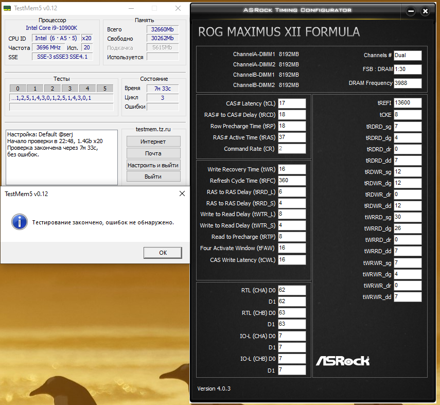 При 1.5V VCCSA/IO 1.25/1.3 4000Mhz 16-17-37, 17-17-37 - ошибки в TM 17-18-36 ошибки 17-18-37 - ОК. Далее зафиксировал 1.43V и VCCSA/IO 1.23/1.275 - если снижать VCCSA/IO - ошибки в TM При занижении dr и dd таймингов (грешу на tWRWR) на незначительные значения (1-2) словил BSOD, еле винду восстановил, неудачно словил).