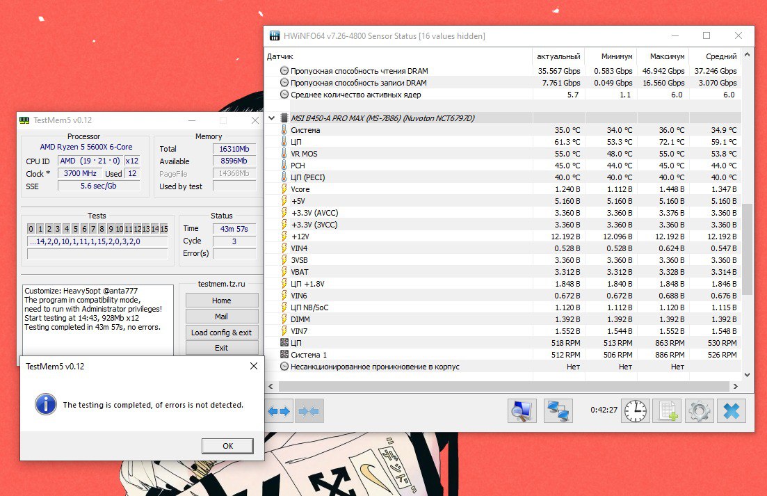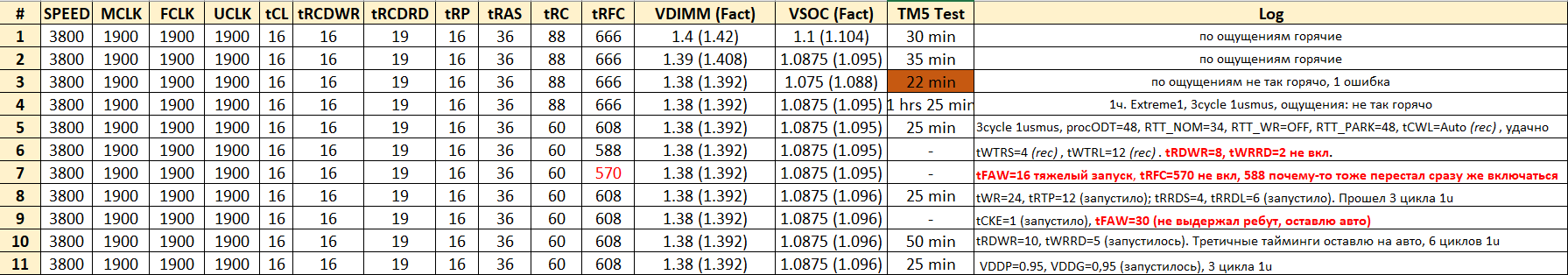 Столкнулся со странным поведением TM5 (профиль 1usmus_v3), есть полностью стабильный конфиг сохраненный в биосе на 3600мгц с расслабленными таймингами, пытаюсь их ужать, получаю ошибки в TM5 (что нормально), перезагружаюсь в биос, выбираю свой стабильный профиль, загружаюсь обратно в винду и в TM5 с первых секунд 1-3 ошибки, тут же перезапускаю тест и он проходит без ошибок. Как это понимать? Глюк самой проги? Это сильно мешает в тестировании т.к. не понимаешь реальные ошибки или нет.