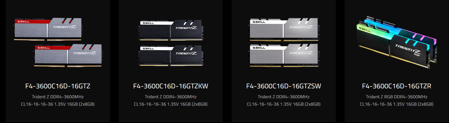 B-die 2x8 Gb Берем любые G.SKILL Trident Z с профилем XMP 3200 14-14-14-34 (маркировка F4-3200C14D-16GT) или XMP 3600 16-16-16-36 (маркировка F4-3600C16D-16GT). Буквы после GT означаю цвет радиаторов, например: F4-3200C14D-16GTZ F4-3200C14D-16GTZSK F4-3200C14D-16GTZSW F4-3200C14D-16GTZKW F4-3200C14D-16GTZR F4-3200C14D-16GTZRX F4-3600C16D-16GTZ F4-3600C16D-16GTZR F4-3600C16D-16GTZKW F4-3600C14D-16GTRSA F4-3600C14D-16GTEGA F4-3600C14D-16GTESA Если в конце маркировки стоит буква "C", то модули будут с таймингами 16-19-19-39 - покупать их не следует (например F4-3600C16D-16GTZRC). B-die 2x16 Gb Берем любые G.SKILL Trident Z с профилем XMP 3200 14-14-14-34 (маркировка F4-3200C14D-32GT), XMP 3600 16-16-16-36 (маркировка F4-3600C16D-32GT), XMP 3600 14-15-15-35 (маркировка F4-3600C14D-32GT) и XMP 3600 14-14-14-34 F4-3600C14D-32GT__A. Буквы после GT означаю цвет радиаторов, например: F4-3200C14D-32GTZ F4-3200C14D-32GTZSK F4-3200C14D-32GTZSW F4-3200C14D-32GTZKW F4-3200C14D-32GTZR F4-3600C16D-32GTZN F4-3600C16D-32GTZR F4-3600C16D-32GTRS F4-3600C14D-32GTRS F4-3600C14D-32GTRG F4-3600C14D-32GTZN F4-3600C14D-32GTZR F4-3600C14D-32GTESA F4-3600C14D-32GTZRA F4-3600C14D-32GTRSA F4-3600C14D-32GTEGA Если в конце маркировки стоит буква "C", то модули будут с таймингами 16-19-19-39 - покупать их не следует (например F4-3600C16D-32GTZNC). Если в конце маркировки стоит буква "A", то модули c XMP профилем начиная с частоты 3600 Mhz будут с более ужатыми первичными таймингами 14-14-14 вместо 14-15-15 (tRCD и tRP у них равны tCL) - покупать их можно, но они дороже на ~10-15% (например F4-3600C14D-32GTZRA против F4-3600C14D-32GTZR).