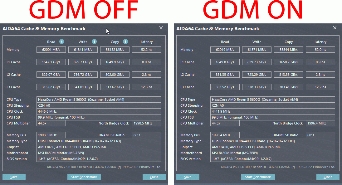 usr721 и без таймингов сопротивлений 1Т работает? Прикольно. У меня на 5600g баллистики только на 3733 без gdm ехали. Интересно, что у меня и при 16-16-16-16 все равно скорость записи чуть выше всегда в аиде на 4х8гб бидаях. А чем так разгоняют латентность, я хз.