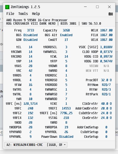 Неа. Во первых я в них не разбираюсь от слова совсем. Вон Анта вобще формулами пользуется. А во вторых, если бы и разбирался, то их ужимание дало бы минимальный эффект. Ибо частота > тайминги. А выше 3533 эта память не едет. Ну как-бы на 3600 типа есть стабильность в "бытовухе", но аидовский стресс-тест на память сразу выдавал error. А я хочу чтобы и в любом тесте была стабильность, ибо внезапная синька пусть и раз в пол года, думаю никому не нужна.