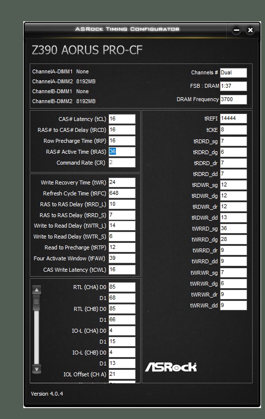Спасибо! В общем тут в соседней ветке выяснил, что на двуранге - msi не даёт ставить RTL руками. Поэтому считаю, что разгон закончен. Итог: от xmp 3200\14\14 получил 4000\16\16 на напряжениях 1.25 \ 1.28 \1.45 Температура по датчикам на памяти 55гр. во время теста extrime. в AIDA64 42,5-43,0ns . Откровенно говоря, ожидал большего. Но тут был спортивный интерес разобраться. Без таблиц было бы сложно собрать в кучу все зависимости и увязки таймингов.