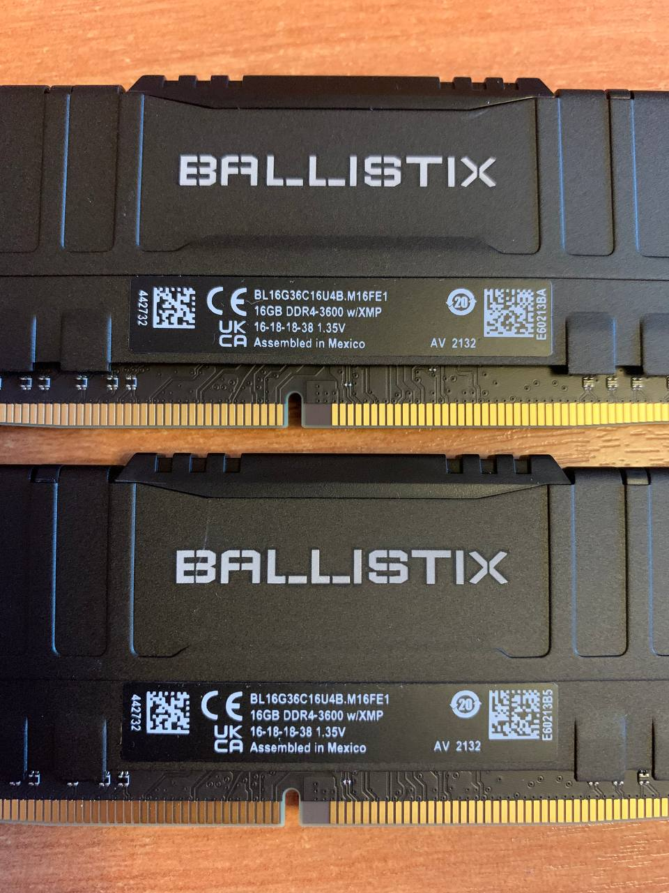 E-die / B-die 2x16 Gb Берем любые Crucial Ballistix с профилем XMP 3000 CL15, 3200 CL16 и 3600 CL16 маркировка (комплект): BL2K16G30C15U4 (Micron rev.E), BL2K16G32C16U4 (Micron rev.E/rev.B) или BL2K16G36C16U4 (Micron rev.B) маркировка (поштучно): BL16G30C15U4 (Micron rev.E), BL16G32C16U4 (Micron rev.E/rev.B) или BL16G36C16U4 (Micron rev.B) (главное, чтобы в маркировке присутствовало U4, последние буквы означают цвет радиаторов) например: BL2K16G30C15U4RL BL2K16G30C15U4WL BL2K16G30C15U4BL BL2K16G32C16U4BL BL2K16G32C16U4R BL2K16G32C16U4B BL2K16G32C16U4RL BL2K16G32C16U4WL BL2K16G36C16U4WL BL2K16G36C16U4R BL2K16G36C16U4B Для того, что бы понять какие планки мы покупаем - dual rank или single rank, достаточно посмотреть шифр после маркировки: M16FE1 -> 16 чипов / 8 с каждой стороны (dual rank), rev.E; M8FB1 -> 8 чипов (single rank), rev.B;