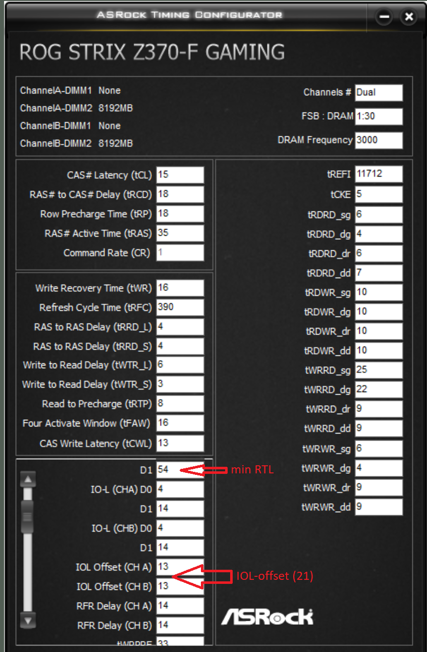 Начните с RCD, CL. Не обязательно должны быть одинаковыми, обычно CL идёт меньше чем RCD. RAS сразу пробуйте как RCD+CL+4, до этого значения от него существенная разница, дальше меньше. CWL<=CL. Допустимые значения 9,10,11,12,14,16,18,20. RP можете выставить по RCD, если пойдёт меньше - тоже неплохо, не уверен правда насчёт смысла. RTP без формул. Если не идёт вниз можно попробовать поднять чуть чуть RP. В DDR4 явно связан с WR соотношением 2 к 1 (например WR20\RTP10), физически хранится одно значения и в зависимости от операции интерпретируется. Скрутите FAW до 16(так и оставьте если работает). С таким FAW скручивайте RRD(оба, L обычно больше чем S), возможно поедут на 4 оба. Если до 4 не удалось спустить поднимите FAW до уровня RRDL*4 и попробуйте ещё, хотя это скорее всего уже почти предел. Обычно L>=S. L - SG(Same Group). S - DG(Different Group) Напр. RRD_L>=RRD_S. CKE=5 СCDL>=4 RDRD_DD и прочие подобные можно проигнорировать если у вас нет двух планок на один канал (4 планки). DD-Different Dimm. Тоже самое с DR-Different Rank если у вас одноранговая память. RDWR_SG(DG) и подобные сочетания скручивайте до минимальных рабочих, потом накиньте сверху +2. Как уже отметил обычно SG>=DG. WTR не трогайте он сам спустится когда будете скидывать WRRD_SG(DG) и прочие подобные. Если сам меньше не стал тогда руками скидывать. WR снижать через WRPRE если есть. Если нет или не снижает WR, То скрутите его скажем до 12 или +4 от рабочего, потом дожмёте если не лень будет. RFC явных формул нет, крутить после всего списка сверху. Не пытайтесь найти его минимальное значение если не хотите чтобы память начинала сыпать ошибками от любого чиха. найдите пограничное со стабильностью значение и накиньте сверху 20 или сразу 40. Может реагировать на RAS+RP, RRD, FAW, причём в обе стороны (то есть может "сломаться" если задрать названные), а может и не реагировать... REFi больше лучше. Связан с RFC. REFI сколько память "работает" - RFC сколько "отдыхает". Оба тайминга лучше не пытаться найти предельное значение.Заметно реагируют на температуру. Многие тайминги отзываются и на температуру и на напряжение. Поскольку напряжение может как позволить снизить тайминг, так и увеличить температуру, то середину можно искать очень долго, поэтому лучше бы вовремя остановится. Тестируйте тщательно с перезагрузками, сном, холодным стартом. RTL и IOL вам кто-то другой пусть советует как настраивать, от них у меня голова болеть начинает...