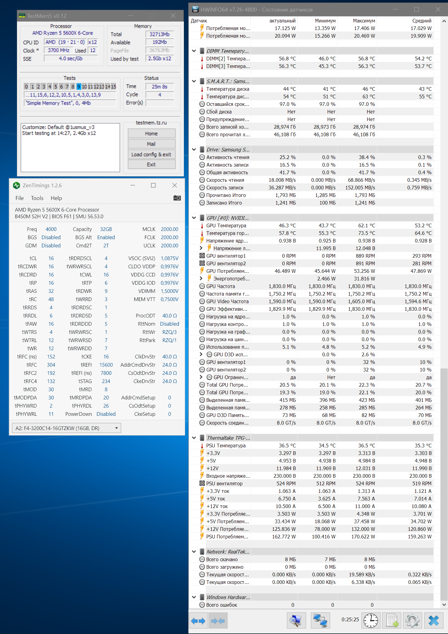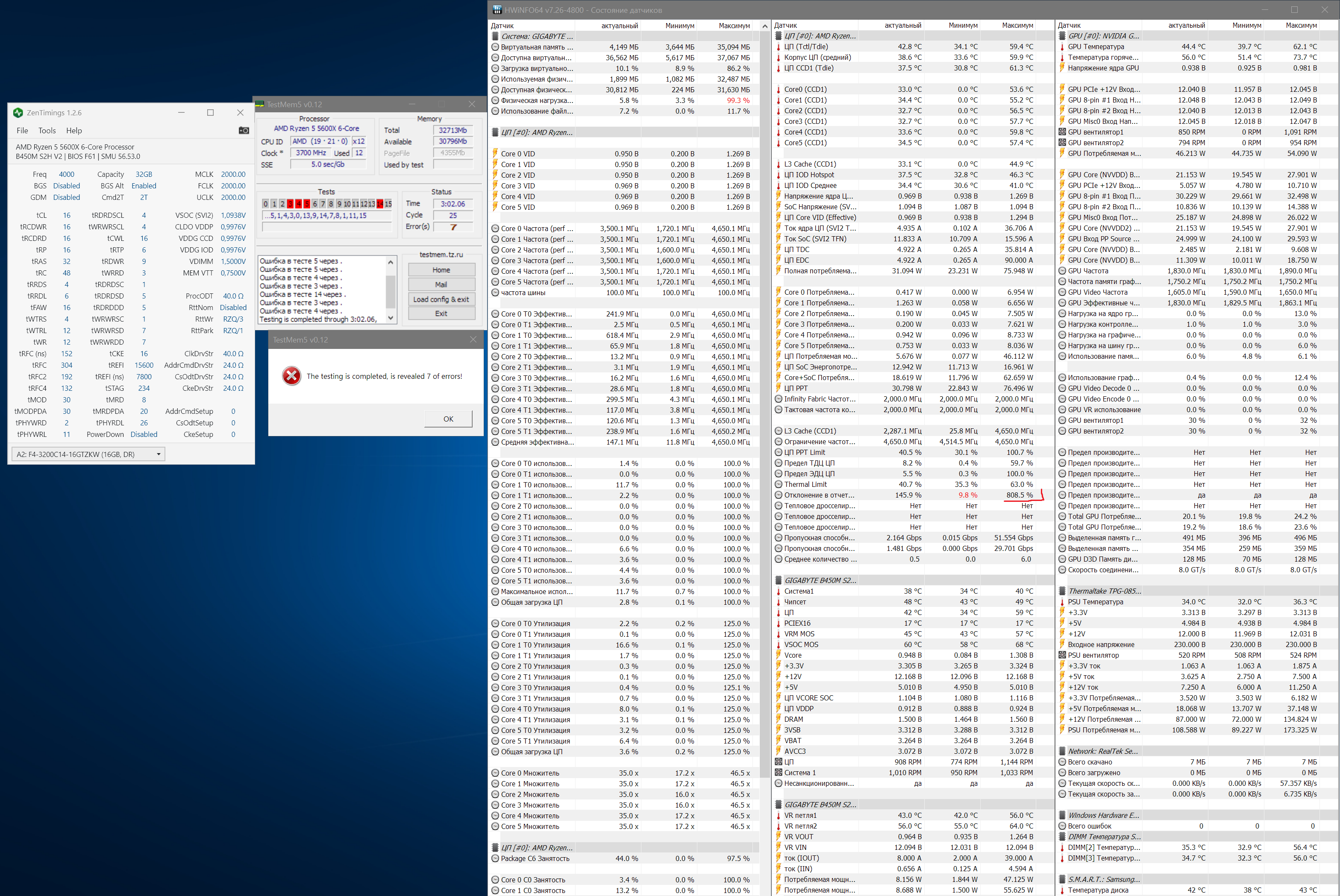 Поставил стресс тест на ночь, нашлись все-таки ошибки. WHEA отсутствуют, что радует. В логах почему то только "Testing is completed through 3:02.06, detected 7 error(s).", хотя раньше писалось время ошибки, насколько я помню. Хотел спросить насчет Power Reporting Deviation (выделил на скрине). Могла ли быть проблема из за того, что включен стандартный буст амд? Хотелось использовать хоть немного реалистичный сценарий, я же не на 3700 проц гоняю. Вроде необходимость прям занижать ядра есть только когда прайм тестируешь, в ТМ5 можно и так. Или стоило включить ctr и залочить в нем 4400-4600? Тогда можно было бы и Afterburner включить, потому что у меня даже в нагрузке гпу так не греется, ибо проандервольчена. DIMM подскакивал до 1.56, тож хз почему. В целом, я бы TRC вернул на 320 для начала, но по остальным параметрам хз даж, что посоветуете?