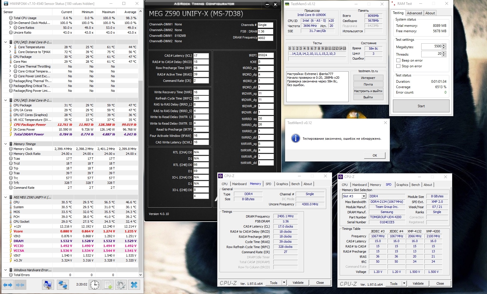 Забрал вчера BL16G36C16U4B. Ну что... Это просто находка! Дешево (относительно, конечно, но 14 тыр за 32 гига это халява, считаю) и... они могут! Гскилы неудачные, скорее всего тупо не хотят работать на частотах выше 3800, то ли потому что платформа Z390, то ли именно на материнках как у меня (нашел тут пост в теме материнок с точно такой же проблемой). В общем эти крушалы без проблем стартанули на частотах до 3866CR1, дальше, не получилось. Но в CR2 сейчас работают на 4200Мгц 18-20-20-40 (напруга, конечно конская, 1,5в, но это пока для тестов) С CR1 валятся ошибки, толи тайминги еще круче надо задрать, но тогда уже CR2+ высокая частота интереснее. Но возможно, и проц 8700K вносит свои коррективы и в CR1 не хочет работать, потому что на такой же матери такие же планки работают у людей на частотах 3900 ис заводскими таймингами 16-18-18-38, но камни там I9. В общем еще раз рекомендую к покупке данные крушалы...