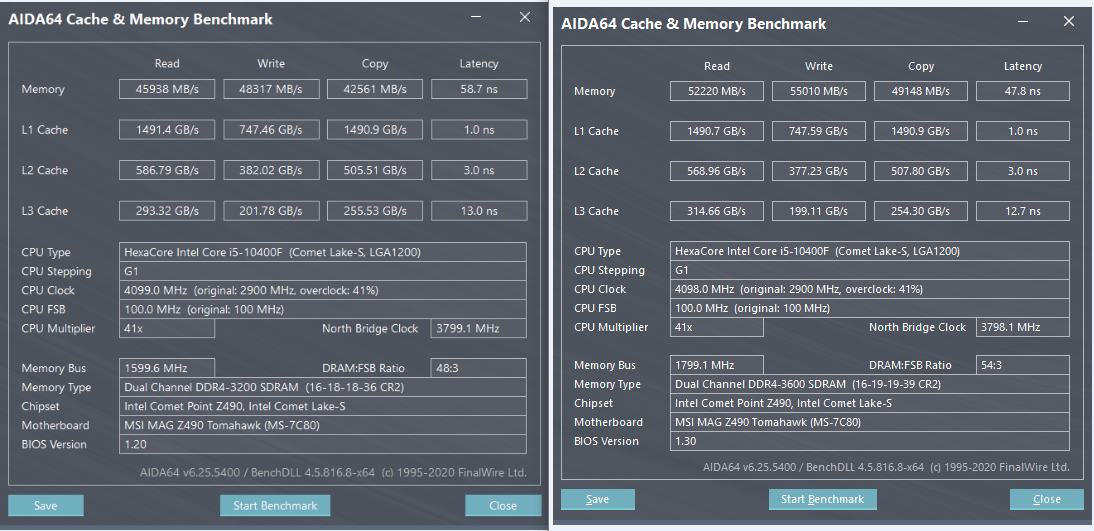 У меня так для сравнения 16гб дуалы U4 3200xmp vs 3600 настроеные с 10400f