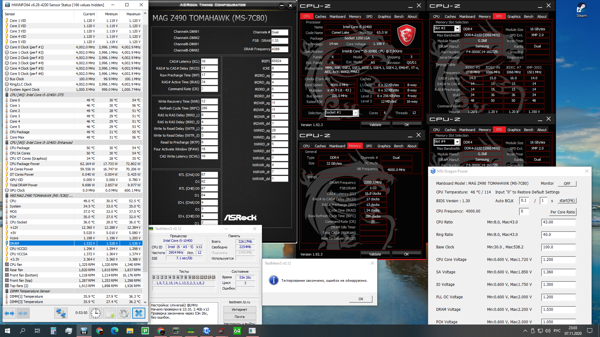 У знакомого есть F4-4600C18D-16GTRS, на MSI MEG Z490 UNIFY завелась только 4400 17-17 CR2, на 4400 16-17 CR2 сразу сыпет ошибками с первых минут вне зависимости от напряжений.