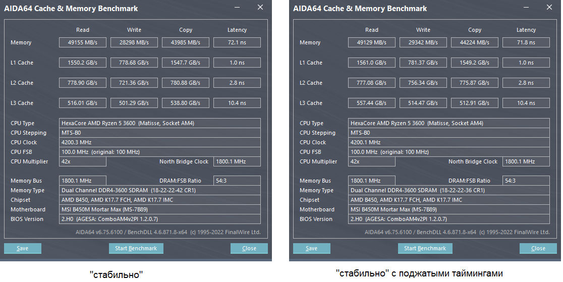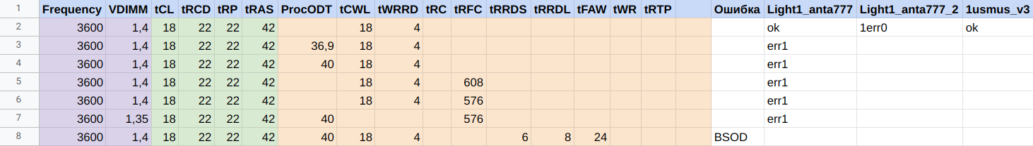 1) Вот этот конфиг оказался близким к стабильному. Тест 1usmus_v3 пройден без ошибок. Тест anta777 Light1 прошел, но при повторном запуске за все время - одна ошибка в тесте 0. 3600, 1.4v, 18-22-22-42, tCWL=18, tWRRD=4