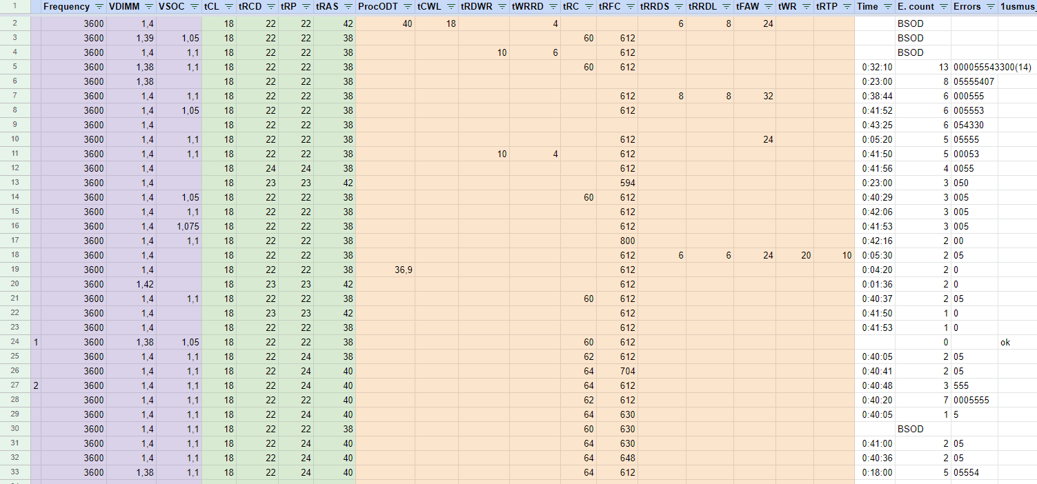 Здравствуйте! Кручу XPG Gammix D20, M16B, одноранк. Сейчас у меня стабильный конфиг по TM5 такой (1usmus_v3 + anta777@Extreme + anta777@Universal): 3600, 1.38v, 1.05 vSoC, 18-22-22-38, tRC=60, tRFC=612 Но стресс-тест AIDA падает при первом запуске на первых секундах (при повторных пока не падал). Мне это не нравится и я решил дальше крутить. Кучу конфигов уже прогнал. Гоняю пока в конфиге 1usmus_v3, потому что он быстро проходит и есть расшифровка ошибок, чтобы немного ориентироваться. Вот табличка. В ней 1 - это стабильный конфиг.