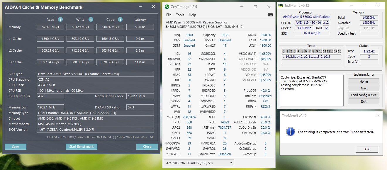 usr721, у вас VSOC=1.05v ровно. Как вы это выставили? У меня в стабильном конфиге на 3600 стоит CPU NB/SoC Voltage -> Override CPU NB/SoC Voltage = 1.05V, но в ZenTimings напряжение 1.0313V. И конфиг (3600, 18-22-22-38 60, tRFC=612, 1.38 vdimm, 1.05 vsoc) перестал быть стабильным. Сейчас запустил его в 1usmus_v3 - 3 ошибки - 0, 5, 4.