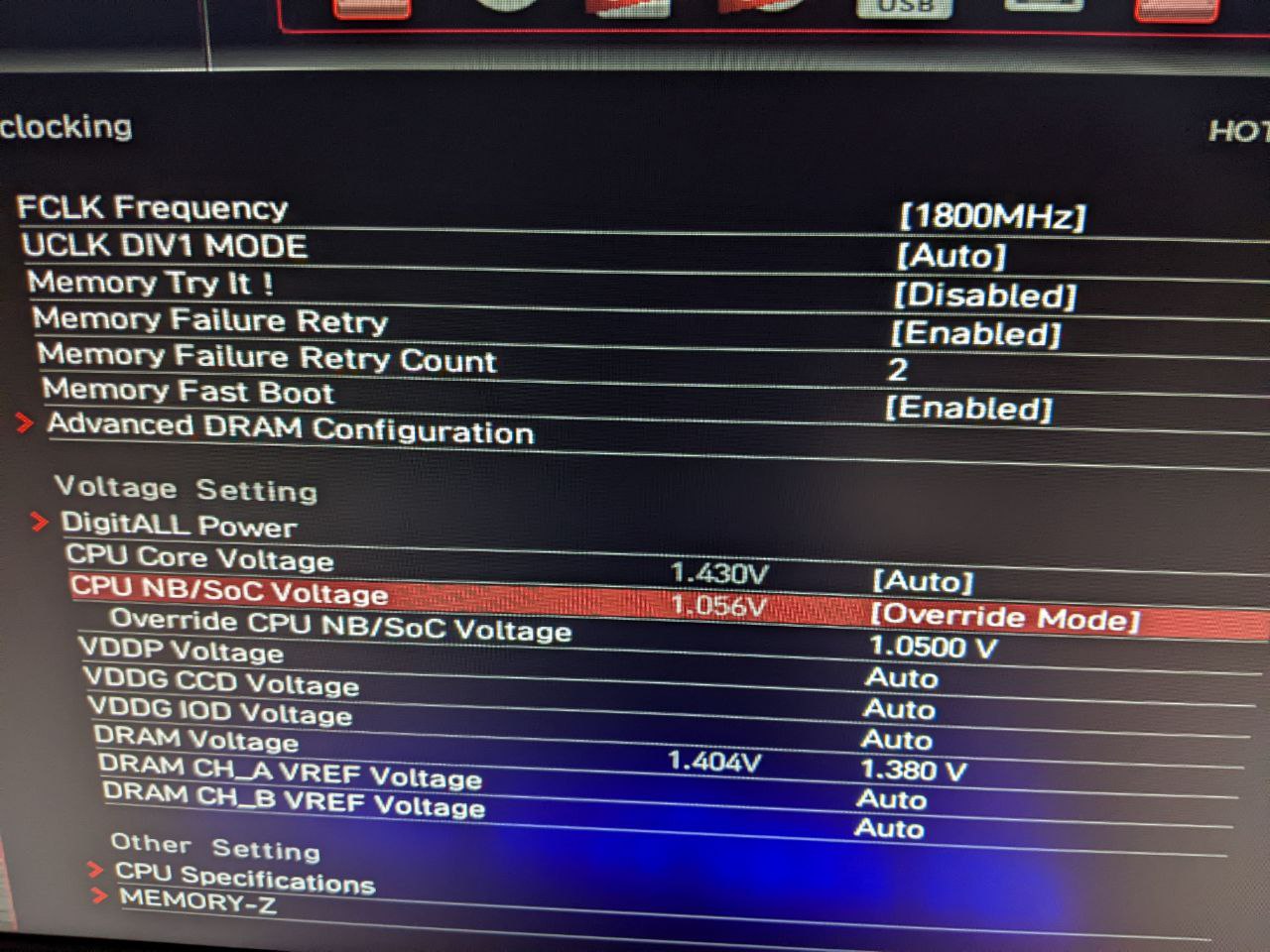 usr721, у вас VSOC=1.05v ровно. Как вы это выставили? У меня в стабильном конфиге на 3600 стоит CPU NB/SoC Voltage -> Override CPU NB/SoC Voltage = 1.05V, но в ZenTimings напряжение 1.0313V.