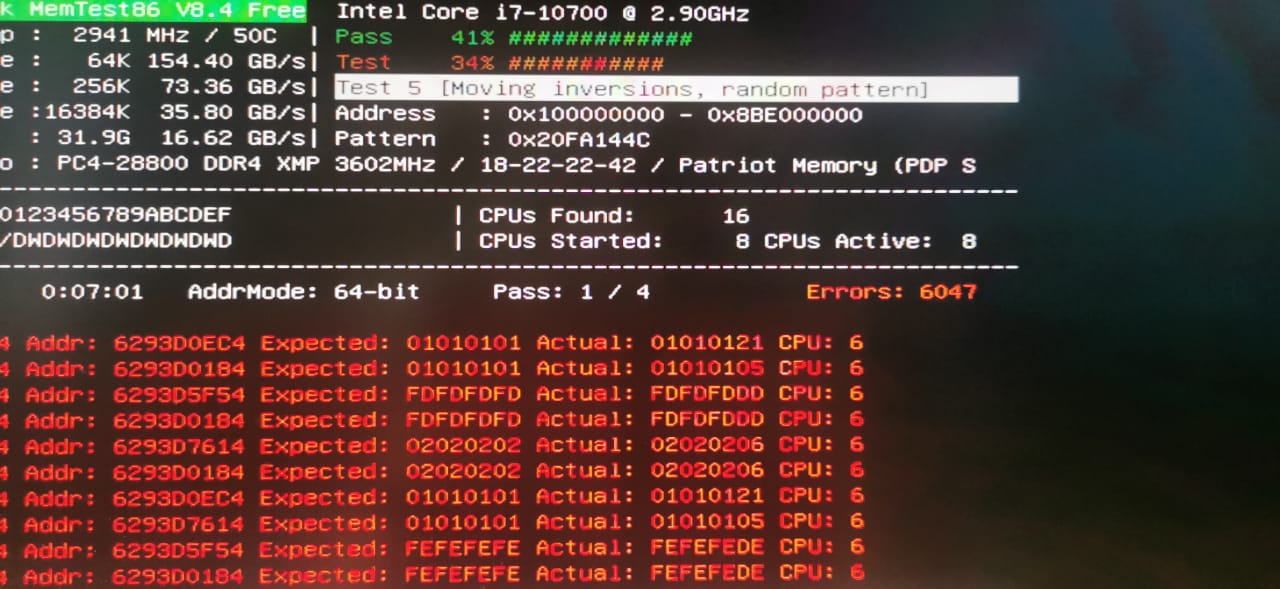 Доброго всем, нужен совет сообщества. При недавнем апгрейде купил и поставил 32 гб оперативки Patriot Memory Blackout DDR4 DIMM PC-28800 3600MHz - 32Gb Kit (2x16Gb) ( PVB432G360C8K) Матплата - GigaByte Z490 UD AC , проц - Intel Core i7-10700 (2900MHz/LGA1200/L3 16384Kb) OEM. Да, возможно конфиг странноватый, но гнать ничего не планировал, просто работать в стоке. Установил Win10, все работало. Потом пару раз словил BSOD по памяти, стал замечать что торренты после скачивания иногда теряют хэш, ну и еще кое какие странности. Решил оттестировать память и очень удручился. Мемтест86 показал множество ошибок. TM5 - аналогично. Ниже , что то есть на скринах , специально протоколированием не занимался. Итог - хочу понять - это приговор и память надо сдавать в утиль? Замена проблемна, мало того что это Плеер.ру, так еще и коробочки я выбросил( Патриотовская поддержка ответила, что сдайте продавцу, из за пандемии мы ничего в Россиюшку не посылаем(( П.С так как в разгонах я ни в зуб ногой, пробовал все ж снижать частоту памяти...ошибки остаются, примерно то же количество. Пробовал тестить по одной, менял слоты на материнке - картина примерно одна и та же, всегда ошибки от 20-40 до очень много. Спасибо.