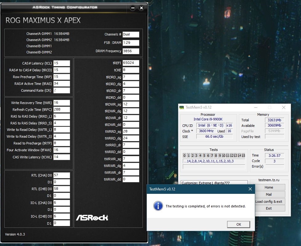 Всем привет! Материнская плата ASUS ROG APEX 10 CPU 9900k память G Skill TridentZ RGB F4-3200C14-16GTZR 2*16 вольтаж на память 1,44 Никак не мог гнать память пока не включил Maximus tweak 1 Кто то может подсказать возможно нужно еще что то включить или накрутить что бы получить CR1 при той же частоте. Просто как мне кажется память спокойно это может. на 4000 15-15-15 даже норм работает при 1,47в и не сыплет ошибки, но есть проблемы с тренировкой через раз, по этому не хочу использовать такой профиль, видимо это предел этой материнки по этому уже тяжеловато ей, а вот 3866 15-15-15 CR1 было бы вообще замечательно. Подскажите кто может что нужно сделать для этого? Или возможно у кого есть опыт с этом материнкой и подобными дуалами, какой профиль будет самым лучшим при 1,45В, не очень люблю когда в корпусе стоят лишние кульки на память. За ранее благодарю!