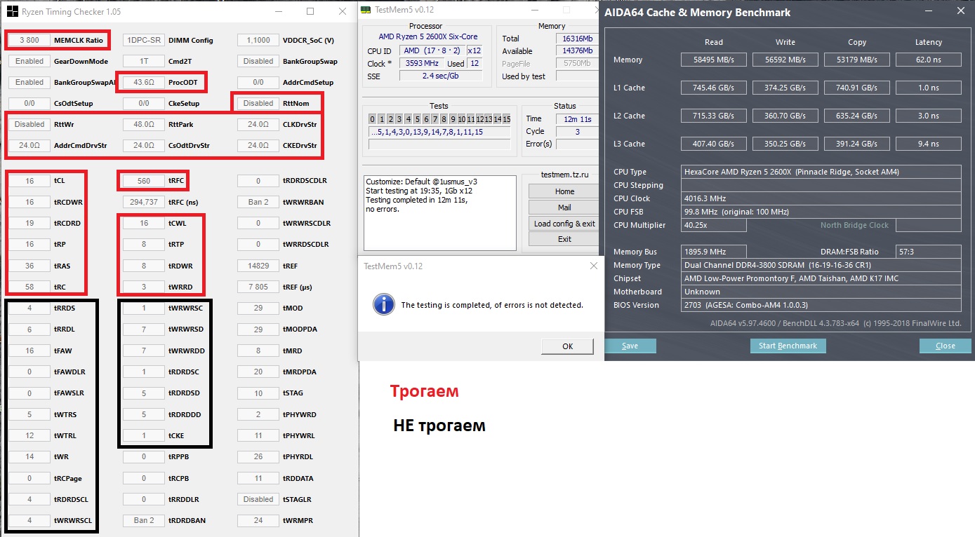 Короткий гайд по разгону памяти для новичков. 1. скачиваем из шапки тайфун и смотрим, какие у вас чипы памяти. 2. открываем калькулятор и для зен, зен+ выбираем частоту в 3200(для B-die, E-die, CJR такая частота не должна быть проблемой) и ваши чипы памяти. для зен2, думаю можно начинать сразу с 3466. 3. обязательно выставляем вручную все из калькулятора, что выделено красным на втором скрине. 4. качаем RTC(для зен и зен+) и Ryzen Master (для зен2), ТМ5 1usmus v3 (есть в шапке), Aida64. 5. RTC\RM нужны, чтобы видеть настройки таймингов и сопротивлений, ТМ5 для проверки стабильности, Аида для базового отслеживания перформанса. 6. если нет стартов, то крутим procodt и tRTP 7. если есть вопросы, задаем их и обязательно прикладываем скрин(пример в шапке), не забывайте указывать вольтажи 8. все что выделено черным примерно одинаково для большинства чипов(если есть расхождения с калькулятором, опираемся на тайминги из него) 9. при успешном прохождении теста на стабильноть(тм5), можно пробовать поднимать частоту и вольтаж 10. успехов!