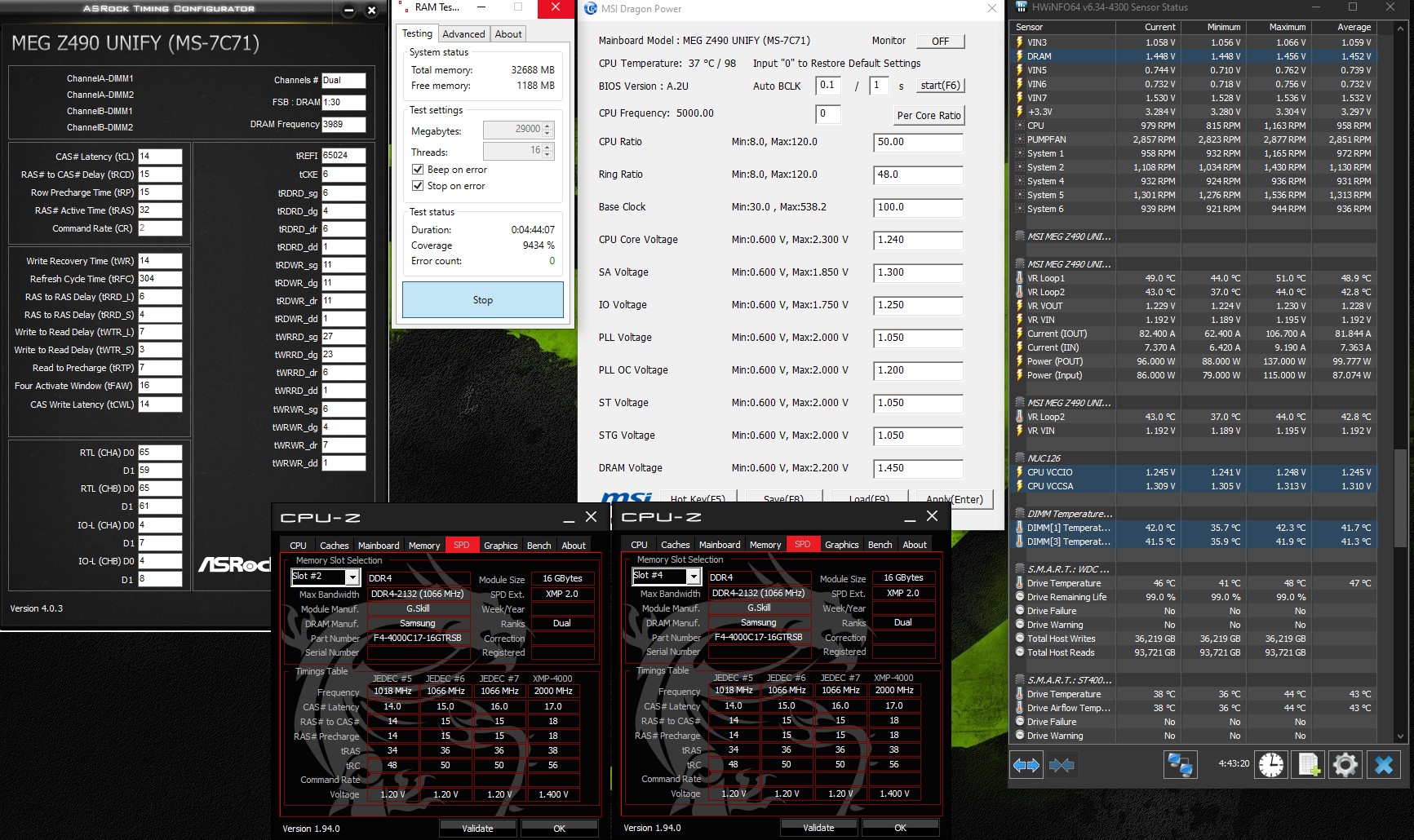 У моих GSkill 2x16 3200@c14 стабильный результат на 4200@17-17-17-36 при 1.42v Может на 4200@16-16-16-34 при 1.46v, но у меня водянка, обдув памяти очень слабый. В tm5 @extreme температура модулей почти 60 градусов Для 4400@17 напруга уже больше 1.5v нужна