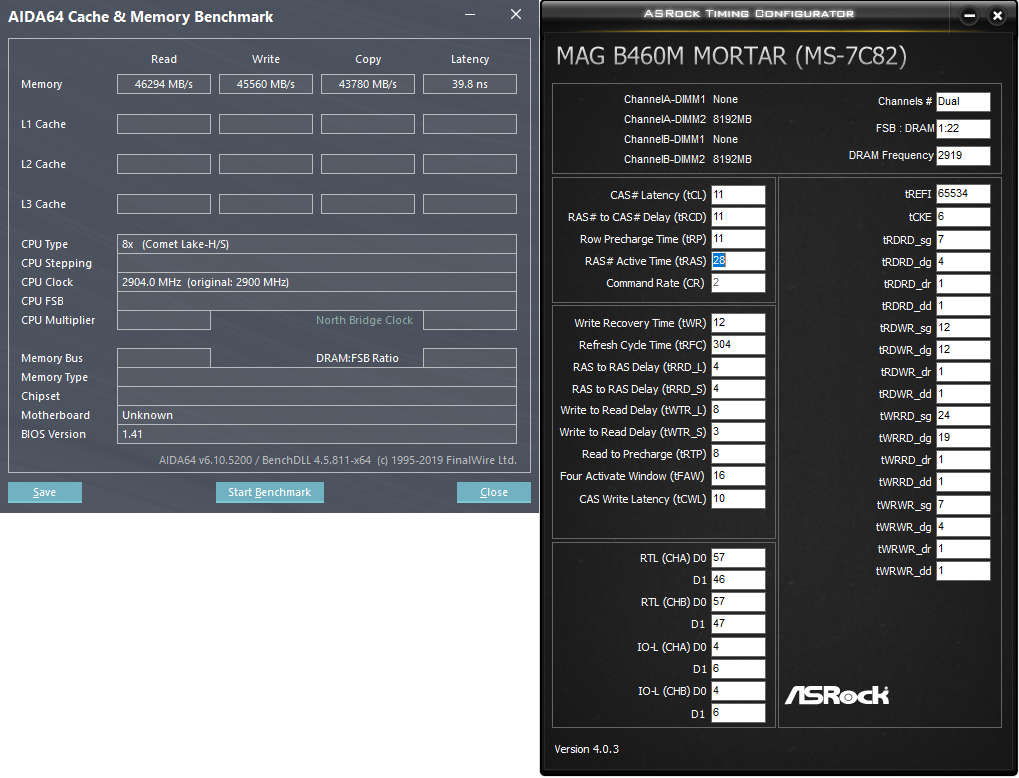 Продолжаю эксперименты с Crucial Ballistix MAX 4400 MHz DDR4 DRAM Desktop Gaming Memory Kit 32GB (16GBx2) CL19 BLM2K16G44C19U4B, которая нестабильно работает на моей системе на ХМР профиле: @ 2197 МГц 19-19-19-46 (CL-RCD-RP-RAS) / 71-770-572-352-11-7-47 (RC-RFC1-RFC2-RFC4-RRDL-RRDS-FAW). При понижении таймингов до 20-20-20-47 - все стабильно. Интересно, что фирменная утилита Ballistix M.O.D. показывает не такие тайминги ХМР, как написано на упаковке, и какие показывает та же АИДА. По данным этой программы, моя память должна работать на: 19-20-19-46. Как я не пробовал на своей материнке поставить эти тайминги, она все равно ставит третий тайминг не 19, а 20. Пока оставил так, тестирую на стабильность. Вопрос к знающим людям, и в особенности к anta777: "Нормальные ли у меня показатели скорости чтения и копирования при 4400 MHz? Может материнка неправильно выставляет какие-то тайминги, и нужно подправить?". Подскажите пожалуйста!