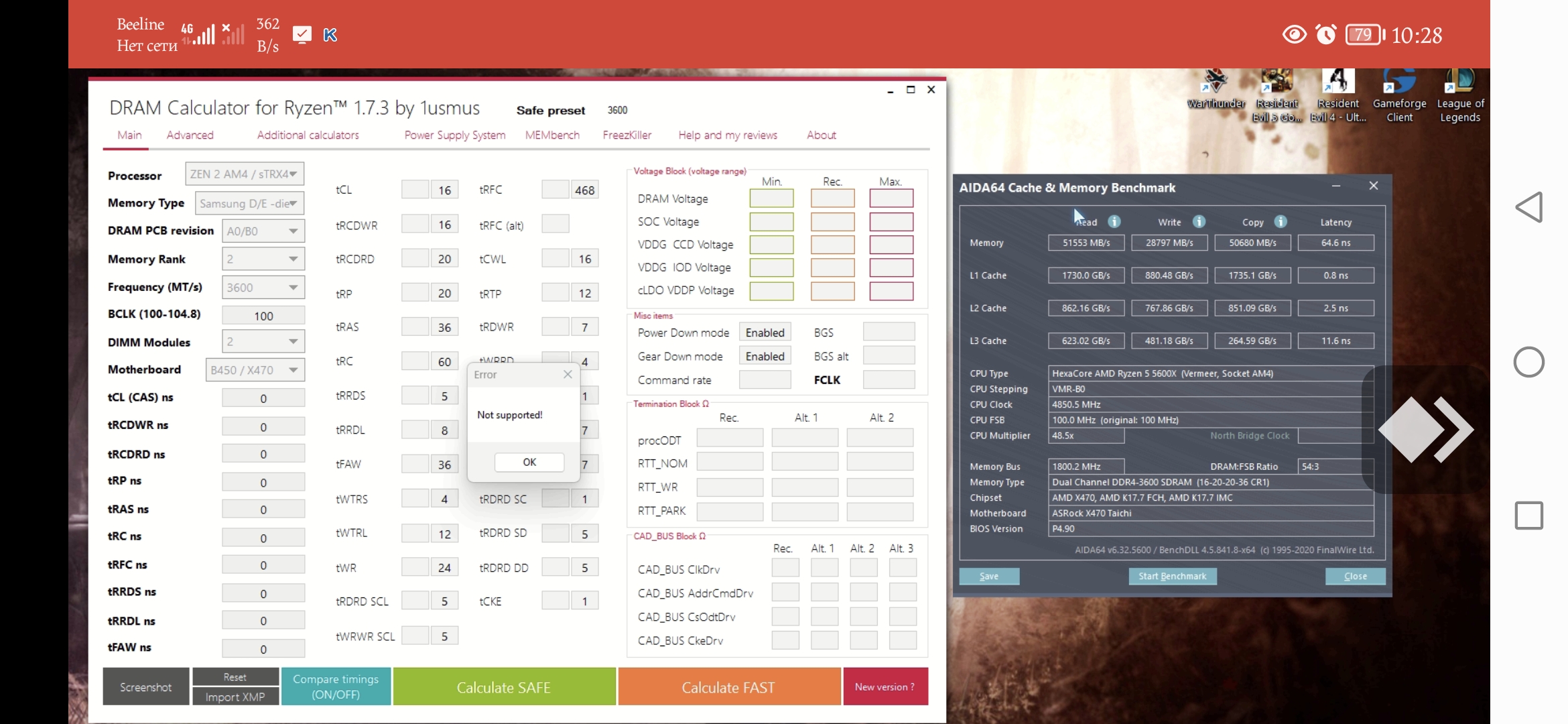 которые и стояли до сих пор, также удалось снизить тайминги до 16-17-16-36 а остальные параметры взять из профиля FAST,сразу же прогнал несколько тестов через LinX, TM5,Aida64 все работало стабильно и без единой ошибки, на то время когда только купил комп биосов на материнку было только 2 или 3 версии, сразу же обновил на последнюю из доступных, также тогда пробовал гнать на 3666,3733 по калькулятору ,но безрезультатно, либо сыпало кучу ошибок либо вообще не грузился комп, я выставил рекомендуемые параметры из калькулятора и забил на это дело кароче. за это время уже вышло несколько версий биоса на метеринку и обновил на самый последний в надежде что ранние биосы возможно были еще сырыми,но ситуация не поменялась, все что выше 3600 с параметрами из калькулятора работает не стабильно, запуск системы есть но ни один тест для памяти не проходит , в чем может быть причина? не знаю, возможно 3600 это потолок для моей памяти...