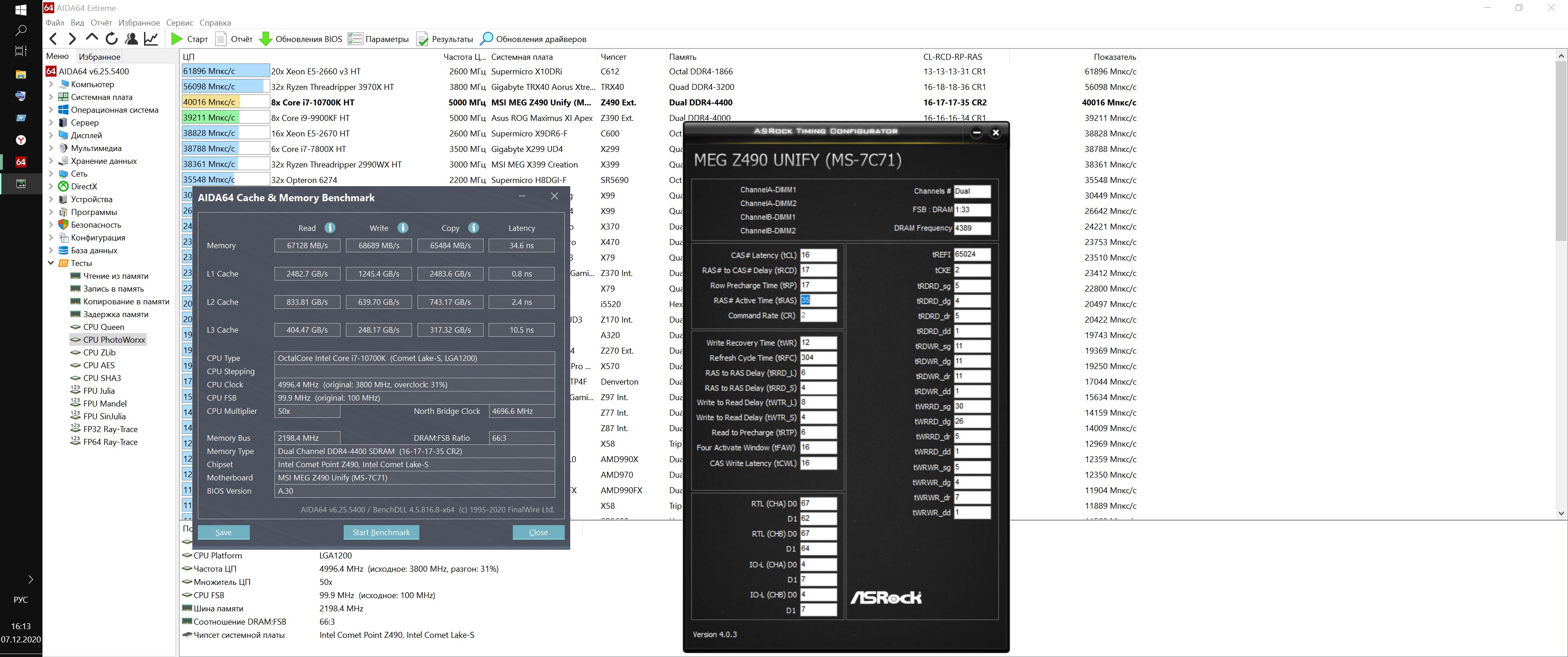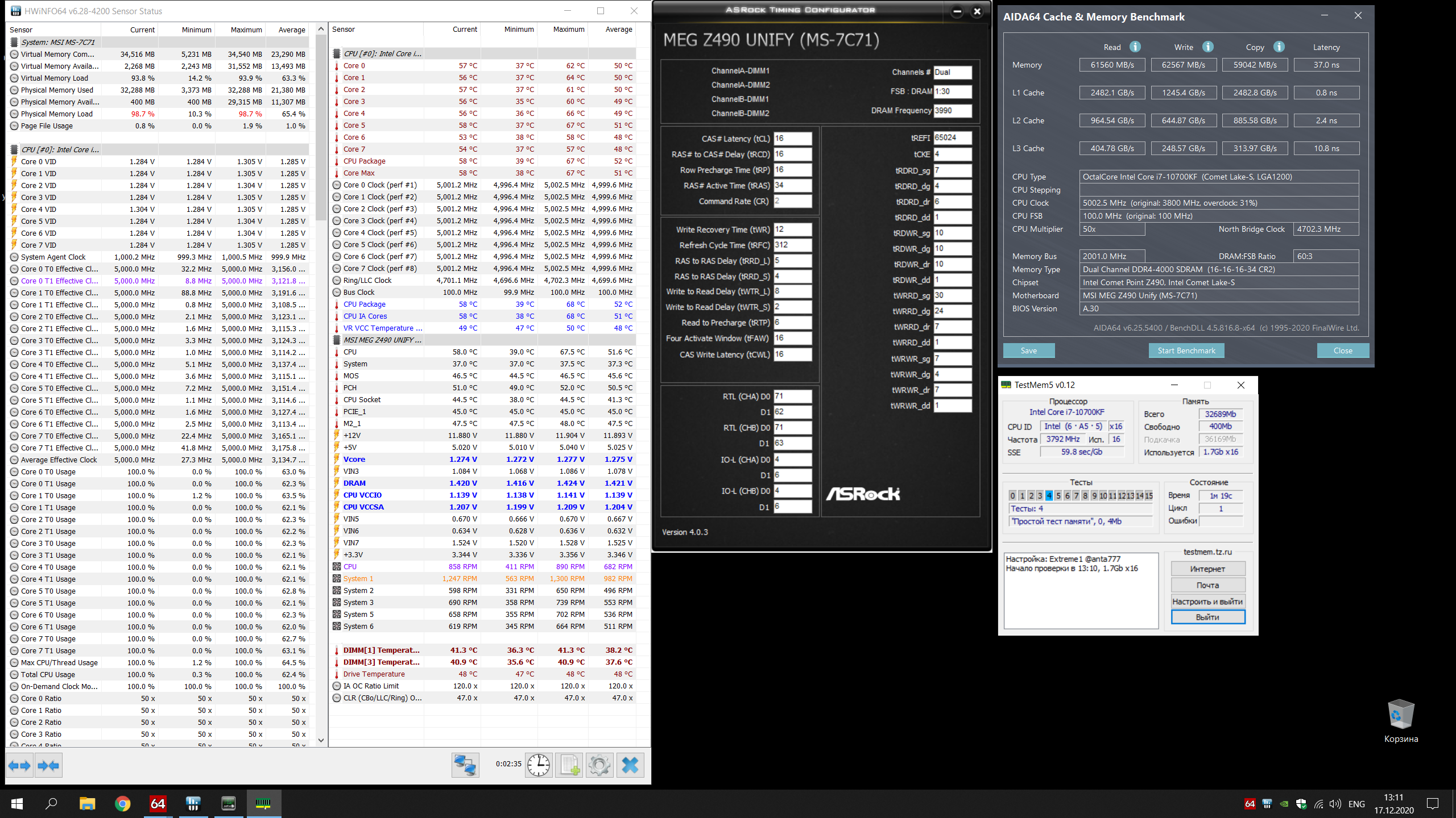 Привет всем, прошу помочь со сжатием таймингов на Crucial Ballistix BL2K8G32C16U4 2x8Gb, собрал новый ПК предварительно посмотрев видос ( https://www.youtube.com/watch?v=Vd-TAggyGSY ) про мать b460 pro4 с 10400f. Поставил все как там, но тайминги (первички) на отрез не хотят вставать, постоянно зависает пк. Я пробовал и 12 14, и даже по инструкции разгона памяти ( https://www.youtube.com/watch?v=Caf1ABAKLZ4 ) 16 21, и другие значения между ними, все крашится. Даже притом, что тест tm5 проходит (иногда и тут виснет), я делаю тест памяти аидой и комп виснет, либо просто спустя небольшое время. Все делал по инструкции с видоса, но ничего не помогает, хз что делать, с напругой играл ставил и 1.4 и 1.45, SA и IO 1.3 и 1.25 соответственно, с ними не экспериментировал, ибо страшно. Проверил обе планки, вроде бы держат 12 14 30, но для этого пришлось поднять напрягу, у меня две одинаковые планки, только одна с подсветкой, та которая без подсветки затарахтела при волтаже 1.416, планка с подсветкой при 1.440. Не нашел как в биосе отключить подсветку, только через программу от крушиал, но это только после запуска винды, и она не запоминает состояние. При подсоединении обеих и выставлении вольтажа в 1.45 пашет по аиде на 1.44, но спустя некоторое время все равно крашится, запустил игру побегал 2-3 минуты завис. пробовал на планке с подсветкой запускать игру, побегал +- столько же мб чуть меньше, все ок было. Хз что можно сделать. Тайминги пробовать поднимать и тестить? Проблема в том, что тяжело быстро спалить, крашится или нет, т.к тесты проходит, бенчмарк тоже, при нагрузке приложениями не крашится (обычно я так крашил когда тестил тайминги раньше), крашится либо через какое то время, но достаточно долго придется ждать каждый раз, либо вот в игре. Вот стоковые показатели.