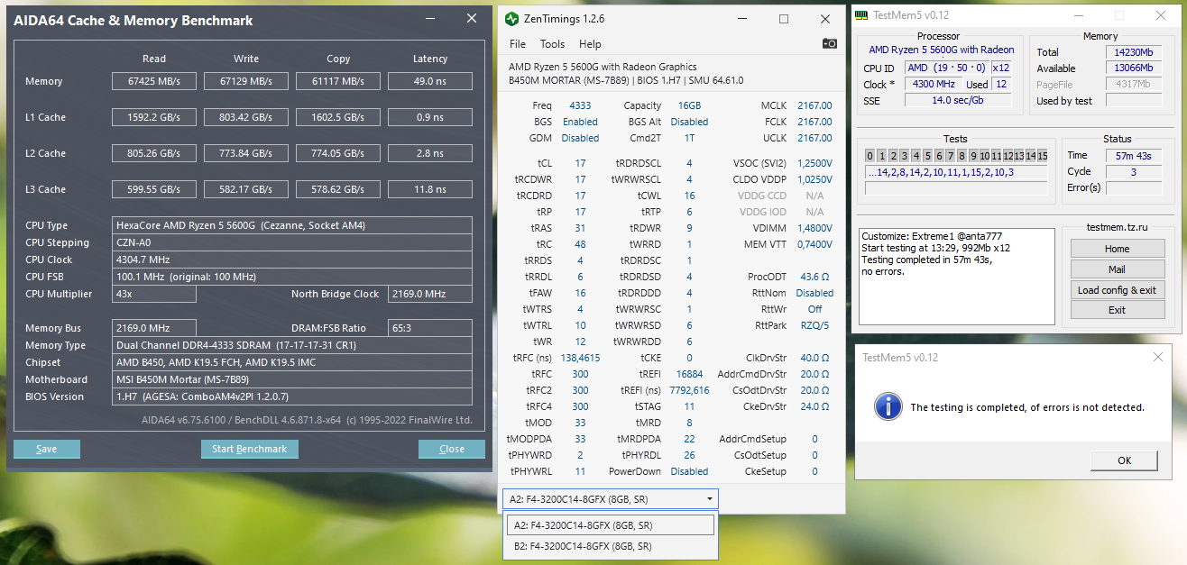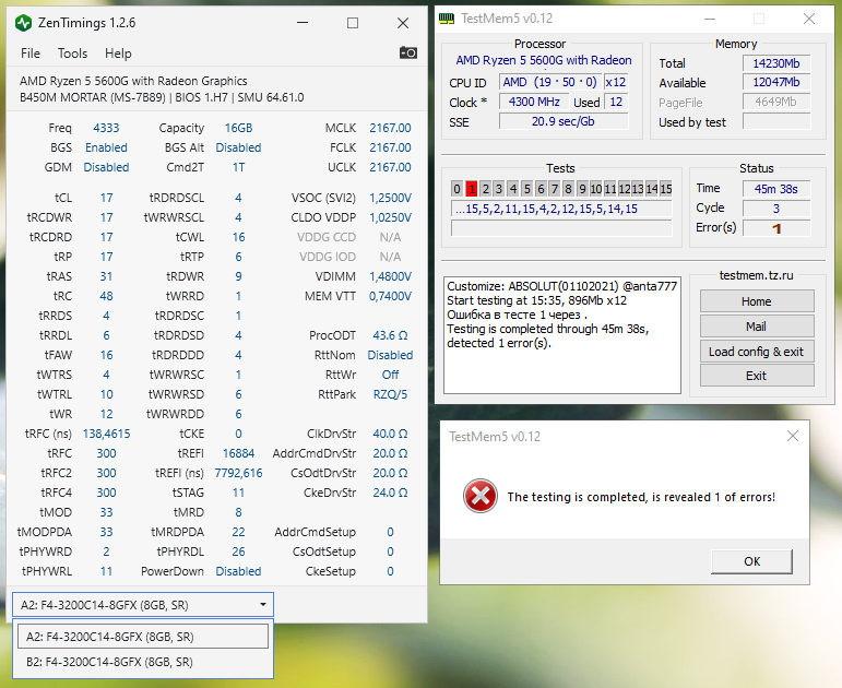 Не первый раз и на разных конфигах замечаю, что при попытке пройти поочередно оба этих тяжелых конфига с ужатыми таймингами (в особенности, RRDS-RRDL-FAW) часто выскакивают единичные ошибки, связанные, как выяснилось по многочисленным прогонам, в первую, а, возможно, и единственную очередь с напряжением vSOC. Речь в данном случае сугубо о проце APU 5600G (как известно, у всех APU порог vSOC выше) и чипах S8B.