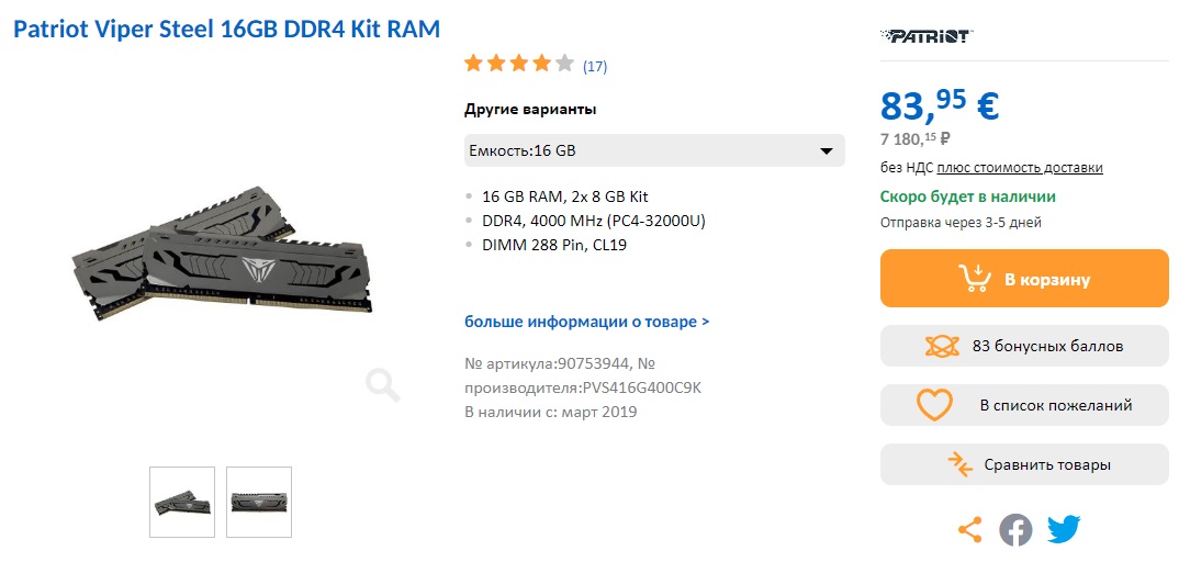 С максимальной скоростью и низкими задержками, то берем память с чипами Samsung B-die. Ценник 10-12 тыс. рублей за 2x8 Gb и 20-22 тыс. рублей за 2x16 Gb.