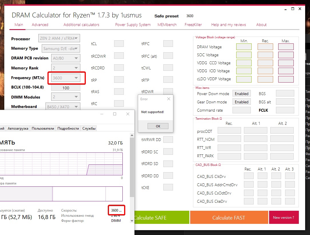Добавлено спустя 7 минут 36 секунд: Как подобрать тайминги на чипах Samsung D-Die? Не разбираюсь в разгоне, точнее знаю как выставлять первички и вольтажи, дальше мои познания заканчиваются, калькулятор пишет, что не поддерживается частота выше 3400Мгц, буду благодарен за помощь, вся информация ниже