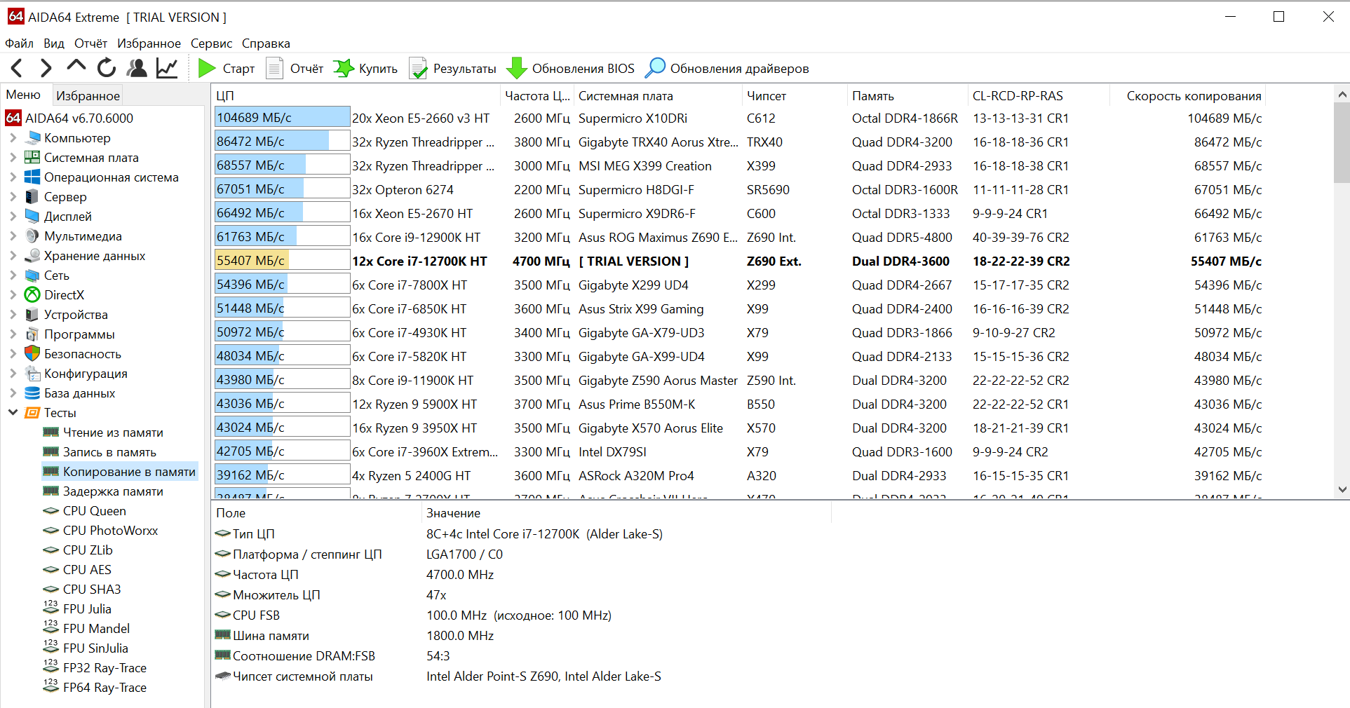 Еще немного статистики на i7-12700K c профилем Normal в BIOS. Результат SOTR в разрешении 1280х720 на минималках - 252 fps. Ранее, (Kingston ValueRAM KVR26N19D8/32) на 2666/19-19-19-43 было 217 fps, разгоном до 3200/19-19-19-43 на ней получалось поднять до 242 fps, но со стабильностью было непонятно. Результат 3DMark Time Spy (CPU Score) - 16 728 (на упомянутой памяти 2666 было 14 817).