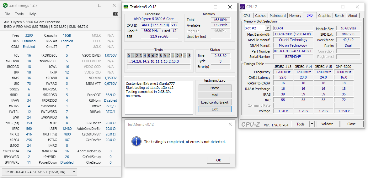 Досталась мне еще 1 плашка ,но на 16гб BLS16G4D32AESE.M16FE (все тот же микрон Е,но dual rank),решил я попытать удачу и завести все 3 плашки на своих параметрах, и естественно чуда не случилось и не завелось. Как и чисто 16гиговая не поехала во втором слоте от цп. Сбросил вроде бы все настройки по памяти,нифига. 3 длинных POST сигнала и жалуется на настройки. По итогу сбросил весь биос на дефолт,запустился на одной планке 16гб,сейчас из настроек только частота выставлена 3200,все остальное в автомате, запустил что бы прогнать ТМ5.