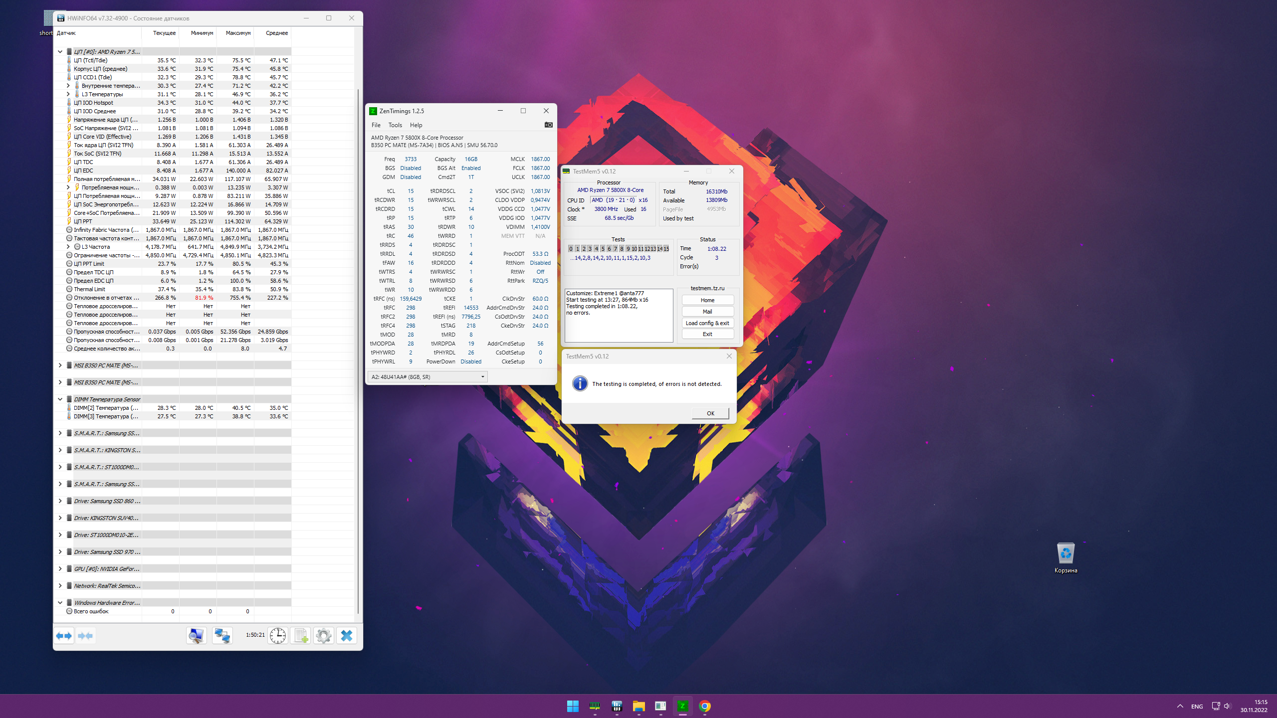 4. Перед настройкой частоты и таймингов рекомендуется установить принудительное охлаждения на модули памяти, особенно для памяти с чипами Samsung B-die, повышение температуры памяти выше 48°, может сопровождаться дополнительными ошибками, не связанными с неправильной настройкой таймингов, что затруднит их поиск и общую настройку памяти.