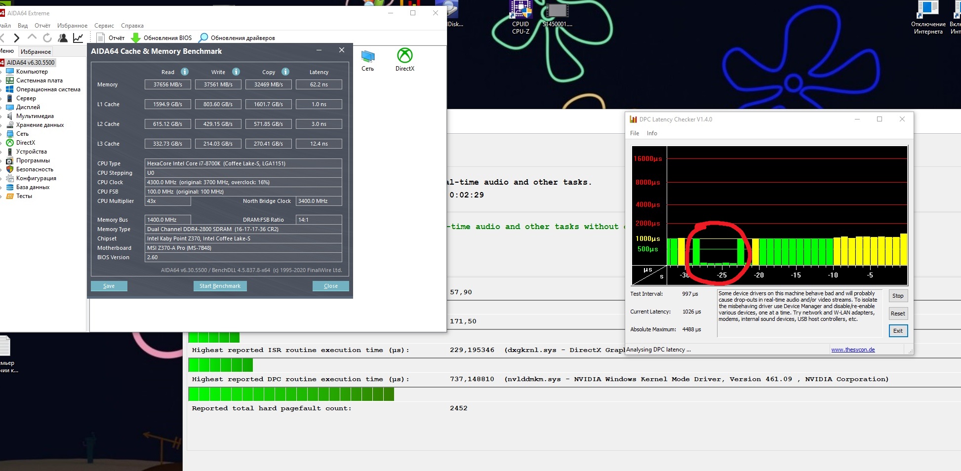 Добрый день, всем добра. Столкнулся с тем, что программа по мониторингу показывает высокое значение Latency(100-700макс , в сети говорят что нормальное значение 10-60ns) иногда происходят рывки, очень редко (обычно когда что-то открываю в винде). Заметил еще такую странность, что при прогоне теста ОЗУ в аиде64 , на моментах просчета Латентности памяти и L кеша процесора, значения латентности в мониторинге программы снижаются до минимума (скриншот ниже), то есть приходят в норму. Может ли быть такое что у проца какие-то сбои? Подтормаживаний в работе самой оси не было замечено, в играх тоже все гладко. Но вот у друга на АМД камне все прекрасно с этим значением латентности. Я пробовал выключать устройства (USB, харды, сетевой адаптер) вообщем результата не дало. Сбрасывал частоту ОЗУ на дефолтные 2400mhz, Латентность самой ОЗУ при этом в тестах аиды64 уменьшилась с 61-65ns до 55ns, но на саму картину это не повлияло. У меня 2 системы на разных ссд дисках, пробовал на обеих, результат один и тот же. Вообщем прошу вас, кто знает решение, помочь. Заранее всем спасибо за внимание. Система i7 8700k stock msi z 370 a pro 8x2 gb 2800mhz 36 rtx 2070 enermax 700 win10 pro стоит на ssd samsung 860evo 500 , вторая на ssd kingston 120