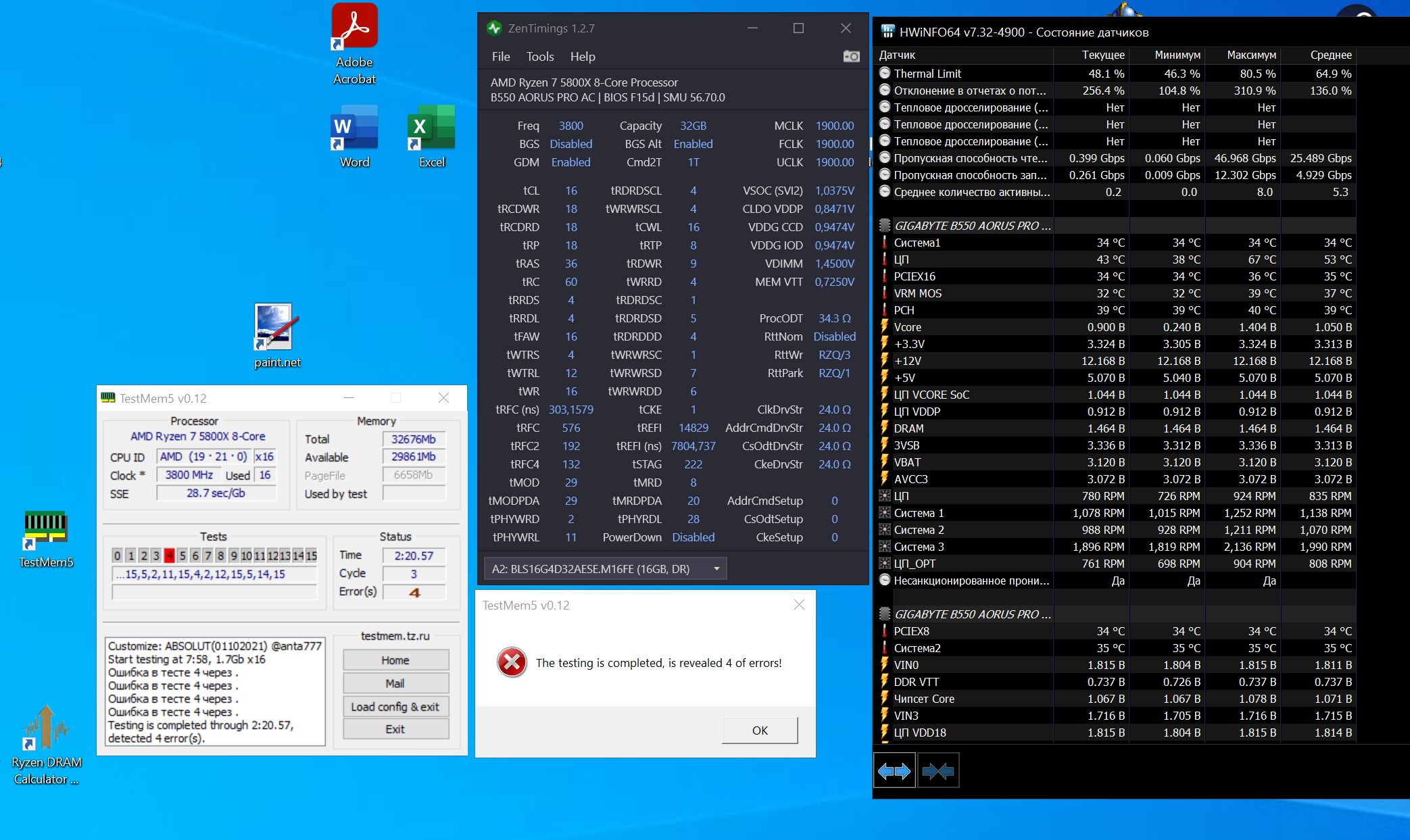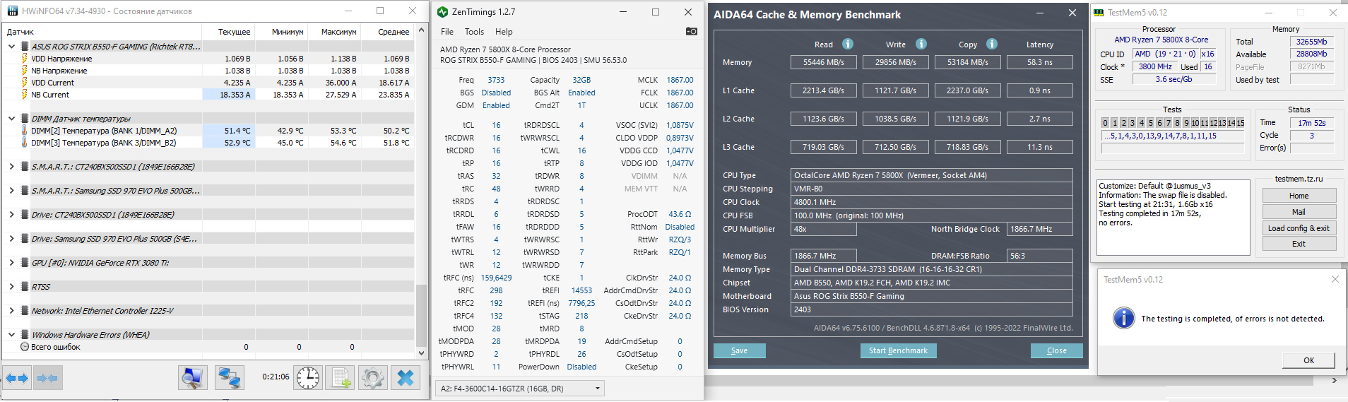 парни, значится запустил ТМ5 на прошлой настройке 3733 на 14-14-14-28-42, и там каждый шаг ошибка, поменял на 16-16-16-32-48, вольтажи все в ручную dimm 1.43, soc 1.1, ccd и iod 1.05, vddp 0.9 и получил такие результаты. не знаю, температуры такие норм? это ещё боковая стенка открыта, чтоб биос сбрасывать. если имеете какие-либо советы по настройке вольтажей или таймингов или ещё чего - с удовольствием попробую. и ещё вопрос по третьему кэшу, меньше 11.3 не было, доходит до 12.9, почему так может быть?