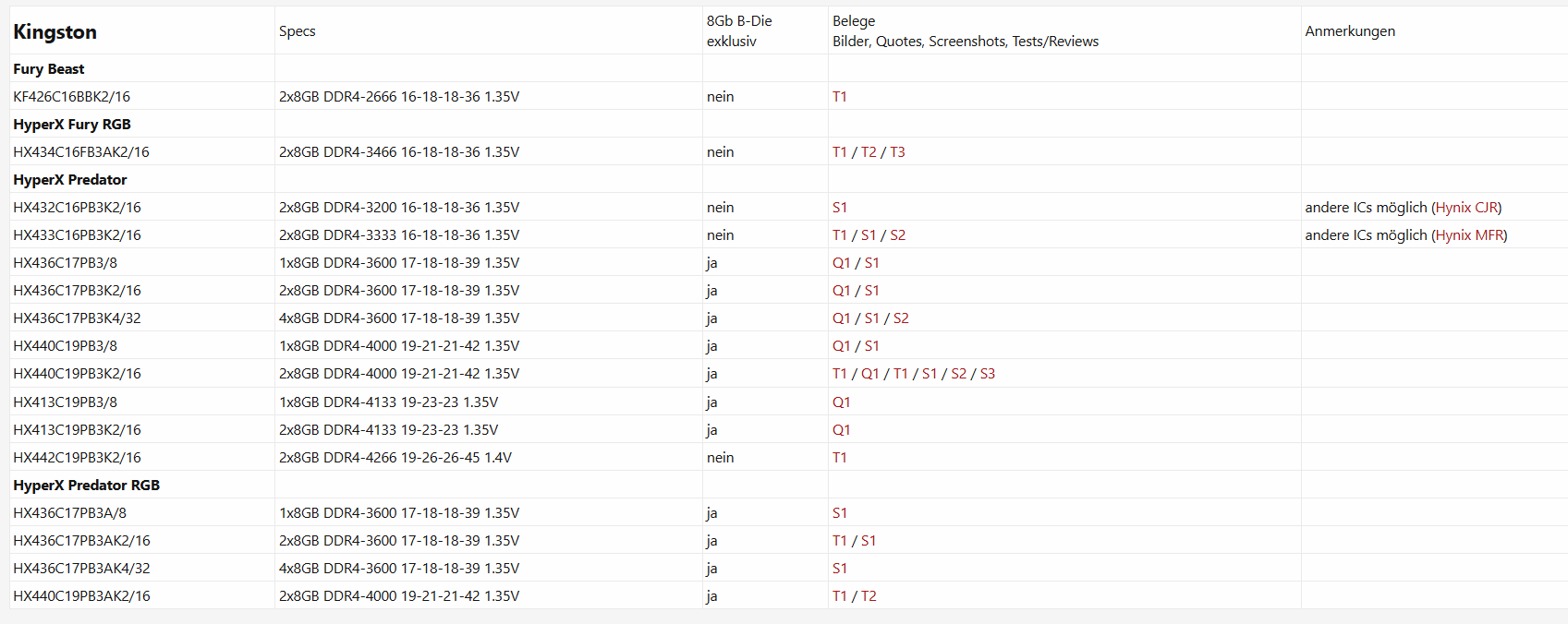 B-die 2x8 Gb Берем любые G.SKILL Trident Z с профилем XMP 3200 14-14-14-34 (маркировка F4-3200C14D-16GT) или XMP 3600 16-16-16-36 (маркировка F4-3600C16D-16GT). Буквы после GT означаю цвет радиаторов, например: F4-3200C14D-16GTZ F4-3200C14D-16GTZSK F4-3200C14D-16GTZSW F4-3200C14D-16GTZKW F4-3200C14D-16GTZR F4-3200C14D-16GTZRX F4-3600C16D-16GTZ F4-3600C16D-16GTZR F4-3600C16D-16GTZKW F4-3600C14D-16GTRSA F4-3600C14D-16GTEGA F4-3600C14D-16GTESA Если в конце маркировки стоит буква "C", то модули будут с таймингами 16-19-19-39 - покупать их не следует (например F4-3600C16D-16GTZRC). B-die 2x16 Gb Берем любые G.SKILL Trident Z с профилем XMP 3200 14-14-14-34 (маркировка F4-3200C14D-32GT), XMP 3600 16-16-16-36 (маркировка F4-3600C16D-32GT), XMP 3600 14-15-15-35 (маркировка F4-3600C14D-32GT) и XMP 3600 14-14-14-34 F4-3600C14D-32GT__A. Буквы после GT означаю цвет радиаторов, например: F4-3200C14D-32GTZ F4-3200C14D-32GTZSK F4-3200C14D-32GTZSW F4-3200C14D-32GTZKW F4-3200C14D-32GTZR F4-3600C16D-32GTZN F4-3600C16D-32GTZR F4-3600C16D-32GTRS F4-3600C14D-32GTRS F4-3600C14D-32GTRG F4-3600C14D-32GTZN F4-3600C14D-32GTZR F4-3600C14D-32GTESA F4-3600C14D-32GTZRA F4-3600C14D-32GTRSA F4-3600C14D-32GTEGA Если в конце маркировки стоит буква "C", то модули будут с таймингами 16-19-19-39 - покупать их не следует (например F4-3600C16D-32GTZNC). Если в конце маркировки стоит буква "A", то модули c XMP профилем начиная с частоты 3600 Mhz будут с более ужатыми первичными таймингами 14-14-14 вместо 14-15-15 (tRCD и tRP у них равны tCL) - покупать их можно, но они дороже на ~10-15% (например F4-3600C14D-32GTZRA против F4-3600C14D-32GTZR).