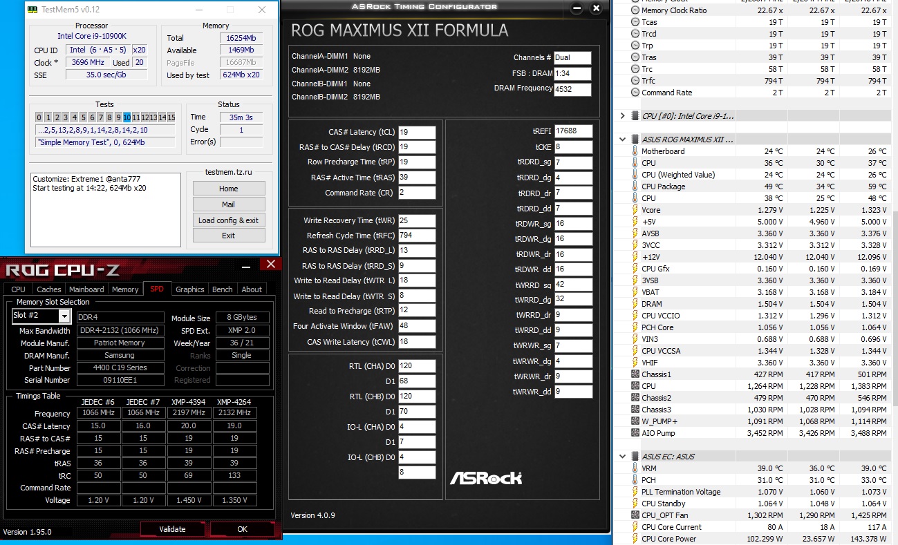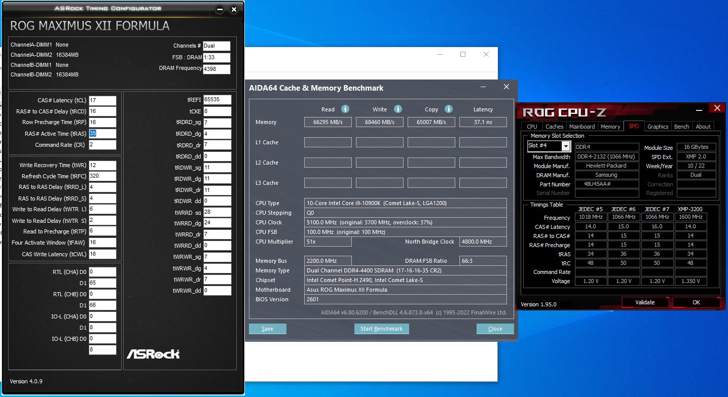 Информация не претендует на актуальную, но на случай если кто-то находится в поиске самого бюджетного решения 2х16Гб B-die, я на себе рискнул опробовать совершенно неизвестный по обзорам кит под брендом HP PC-3200 14-14-14-34@1.35v XMP. Очевидно, что это b-die, но я сильно опасался за ноунеймовое исполнение самой печатной платы, где бы сэкономили на слоях, либо каких-то критически важных для достижеения высоких частот компонентах. Полное наименование HP V10 rgb 32gb 48U45AA. И, как оказалось, вполне себе приемлемая память в плане разгона на платформе intel. У меня середины 22го года выпуска 10900К с очевидно нее самым лучшим на планете IMC и Maximus XII Formula на самой свежеей версии биос. Трудность перехода с Maximus XI Hero и 9900К была в топологии памяти новой платы. Z390 была T-type и отлично себя вела в разгоне 4х8Гб Patriot Viper Steel 4400 19-19-19-39@1.45 XMP. Плата позволяет 4266 17-16-16-35-2Т и очень хорошо затянутыми третичными (почему-то кроме WRWR_dd = 9) На 4400 - затык, будь то XMP, либо ручная настройка MAximus Z490 на daisy chain. И 4 планки для высоких частот в данном случае не лучшее решение. В итоге плата хоть и стартует на 4400, но стабилизироваться даже с 19-19-19-39 не дает. Равнозначно 4266. 4133 тоже слишком рандомно выдает ошибки в TM5 anta777@extreme. В итоге, пока ждал новый кит памяти -вот что получилось. 4х8