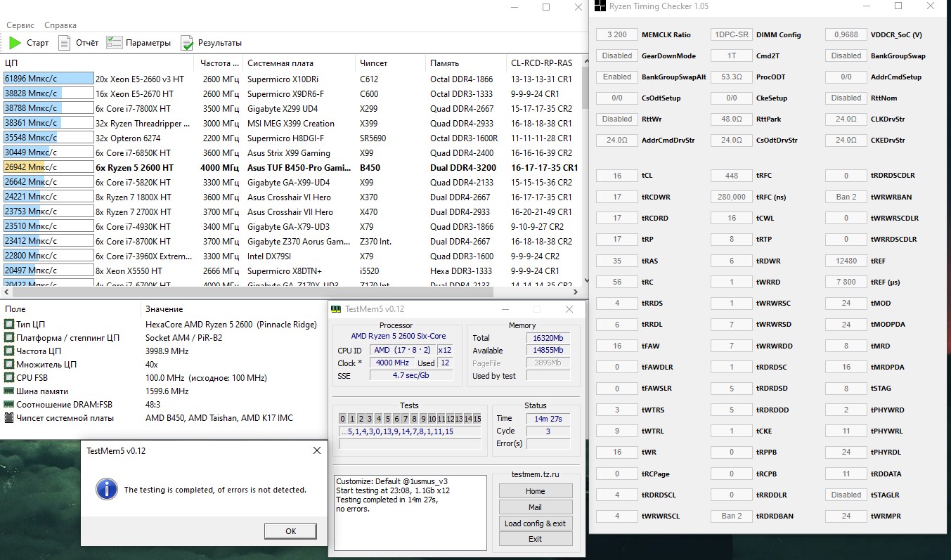 ребята, память CMK16GX4M2B3000C15R (R - red), тайфун пишет якобы это самсунг б-дай, но что-то я сомневаюсь, да и неважно, мне просто хочется узнать что там за чипы на самом деле и на что эта память способна, копал интернет, многие иностранцы сомневаются что там самсунг, скорее хайникс, но какой именно - никто не знает. 3200 ниже чем с 16-18-18-18-36 либо не заводится, либо с кучей ошибок. может есть у кого такая же память? SOC V 1.025, DRAM V 1.36. Выше 3200 ни с какими таймингами не проходит тесты. вторички даже не трогаю пока - такой треш начинается))