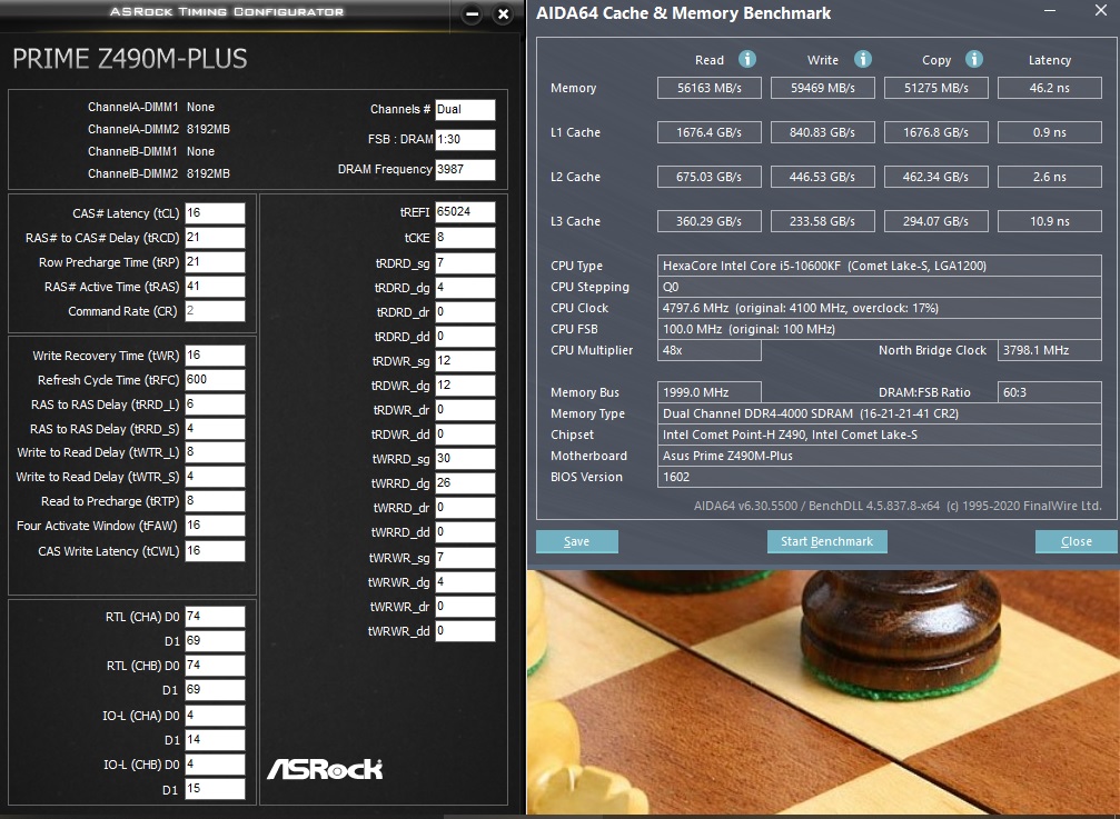 Приветствую всех! Повозился с небольшим разгоном памяти hyperx hx426c16fb3k2 (4 планки по 8GB двумя комплектами) на материнке MSI Z490-A PRO, процессор i5-10600kf. В итоге, получил небольшой буст по сравнению с базовой частотой. Но т.к. разгонять пытался "топорно", то есть неcколько вопросов. Буду благодарен, если поможете их прояснить, либо советам по оптимальной настройке памяти. Что было сделано: сначала просто выставил в биосе частоту, основные тайминги и напряжение, как у такого-же модуля на 3600 (17-21-21-39 1,35В) при включенном XMP, заработало, мемтест 4 прохода прошёл без ошибок. Затем выставил параметры от модуля 3733 (19-23-23-39) тоже заработало, но с такими таймингами не понравилось. При выставлении в биосе частоты 3600 напряжения VCCIO и VCCSA становятся 1,25В и 1,35В, а при 3733 - vccio 1,3В и vccsa 1,4В, если выставлять эти же частоты с двумя планками памяти, то напряжения немного ниже, порядка 1.118 и 1.254 при 3600. Вот тут и возник первый вопрос: это нормальные величины (особенно vccio 1,3 и vccsa 1,4) ? После этого попробовал выставить тайминги согласно excel таблице из этой темы (та, которая 2020года). В принципе, с таймингами из таблицы для частоты 3733 память запустилась (правда в биосе больше различных таймингов, но те, которые не были указаны в таблице, я не трогал), но в мемтесте на тесте 6 (перемещение блоков) наглухо вешался комп, ошибки даже не успевали появиться. Тогда я вспомнил, что в таблице были параметры tWR - 18 и tRTP - 9, а в биосе были эти параметры и плюс ещё tWR_MR и tRTP_MR имеющие такие же параметры, как у и тех, что выставлял из таблицы и я их оставил в Auto, решил, раз они одинаковые были до внесения изменений, то попробую и их выставить такими же значениями. как tWR и tRTP. После этого, первый раз за три месяца после сборки компа, я полез искать перемычку для сброса cmos:) Т.к. если раньше материнка сама восстанавливалась после моих "косяков" с таймингами, то сейчас она пару раз включилась и выключилась и на этом всё. После сброса настроек биоса на дефотл и загрузки работающего профиля 3600 17-21-21-39, я вручную понизил напряжения VCCIO до 1,150 и VCCSA до 1,200 (может и зря). Прогнал мемтест 1 проход, и пришёл сюда. Теперь от слов к скриншотам. Вот так сейчас (это один из лучших показателей, т.к. в винде они меняются в зависимости от количества фоновых процессов):