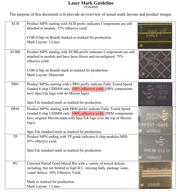 npa4ka, не слушай местных знатоков, которые поддавшись коллективному диванному разуму как под копирку вторят одно и то же, что Spectek занимается только отбраковкой. Все они - типичные обыватели и дилетанты и много не знают. Есть микросхемы Micron, прошедшие испытания Spectek с результативностью 100%, т.е. микросхемы полностью годные. У таких микросхем полная маркировка начинается с PRN- и PRM-. Смотри вложение.