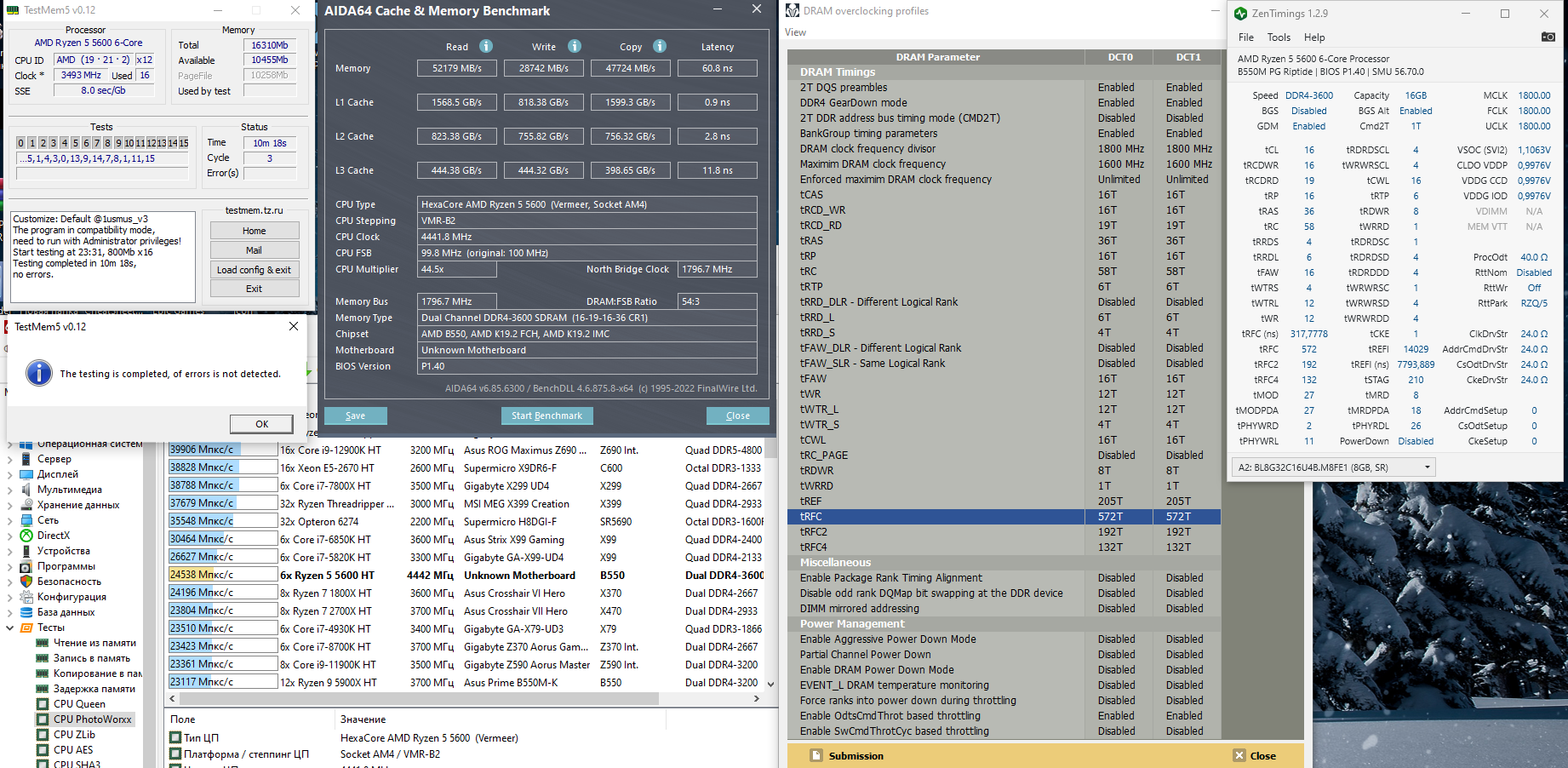 С 3733 FCLK 1866, RFC 576, всё остальное как было. vDIMM 1.39V, vSOC 1.1V. Всё так-же как и выше только времени чуть больше и ошибок чуть меньше. При тесте в программе TM5 (с настройками по умолчанию) спустя секунд 15 высыпало 5 ошибок, дальше не тестил.
