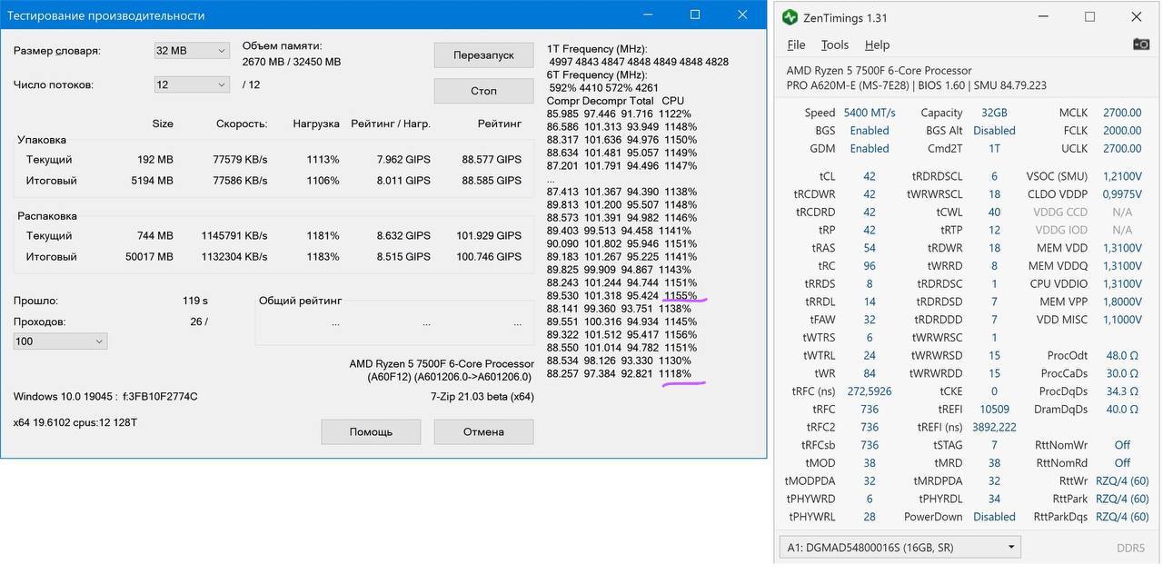 Лучше объясни нормально, что показывает разница более 25% и где её там смотреть)) И мы тут как бы разгон ддр5 обсуждаем, а не процессоров. Я и без 7zip знаю как разогнал процессор, есть более релевантные тесты это узнать.